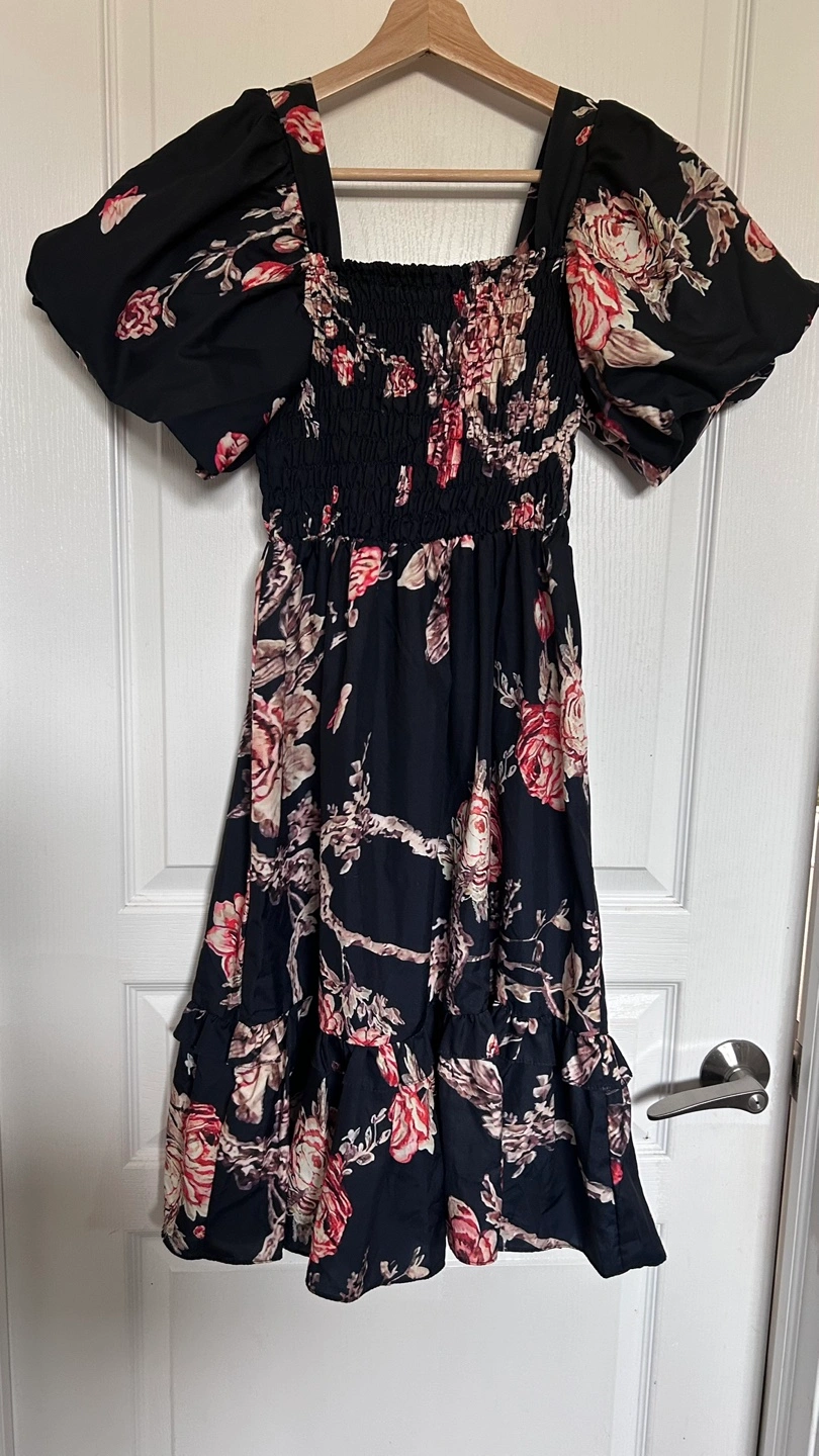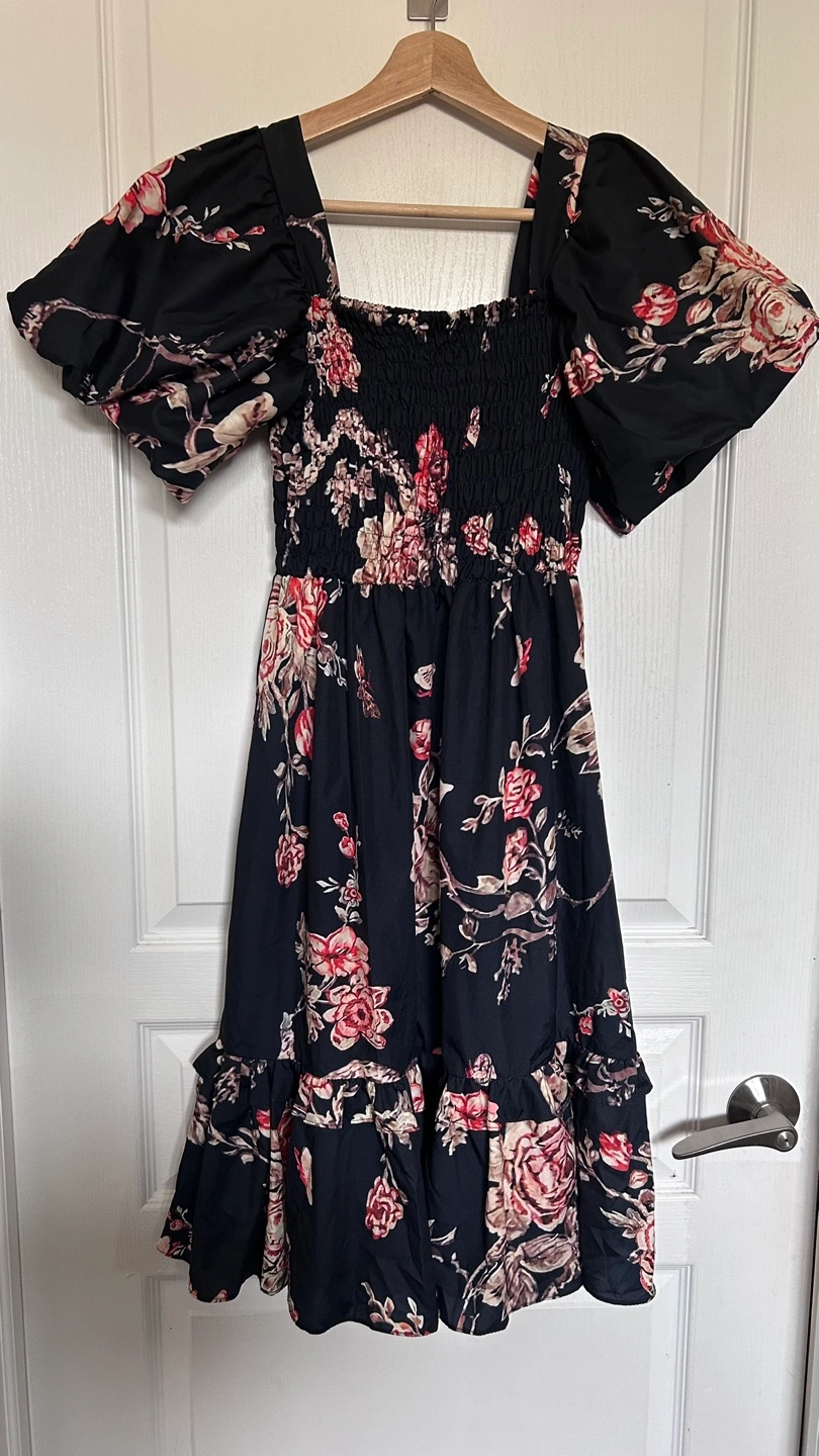 Black floral midi dress. Puff sleeves. Square neckline. Smocked bodice. Tiered skirt. Great for summer.