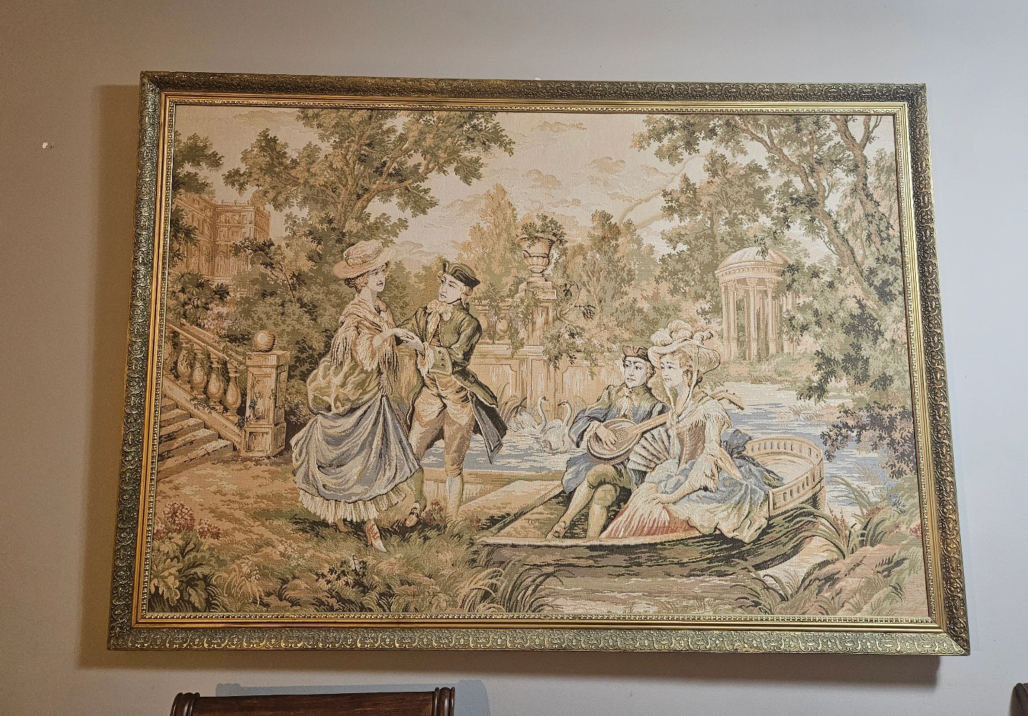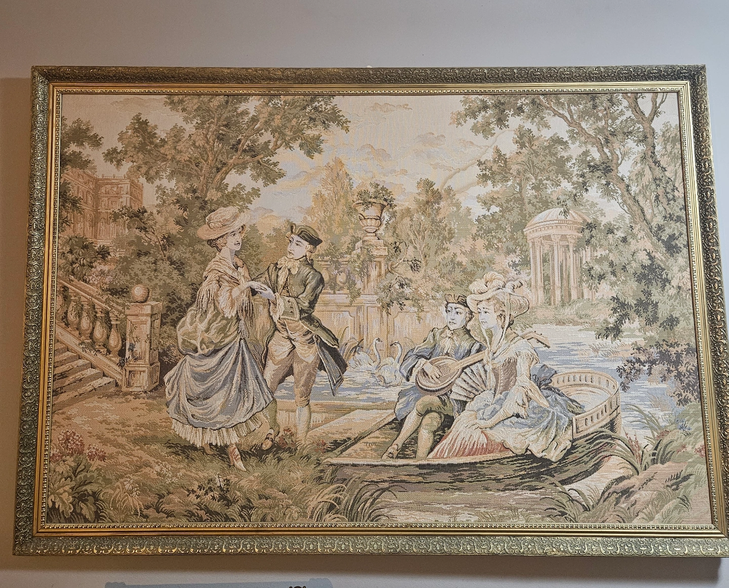 Large framed tapestry. Elegant design, depicts a romantic scene in a garden setting. Gold ornate frame. Perfect for adding a touch of vintage charm to your home décor. 59×41"