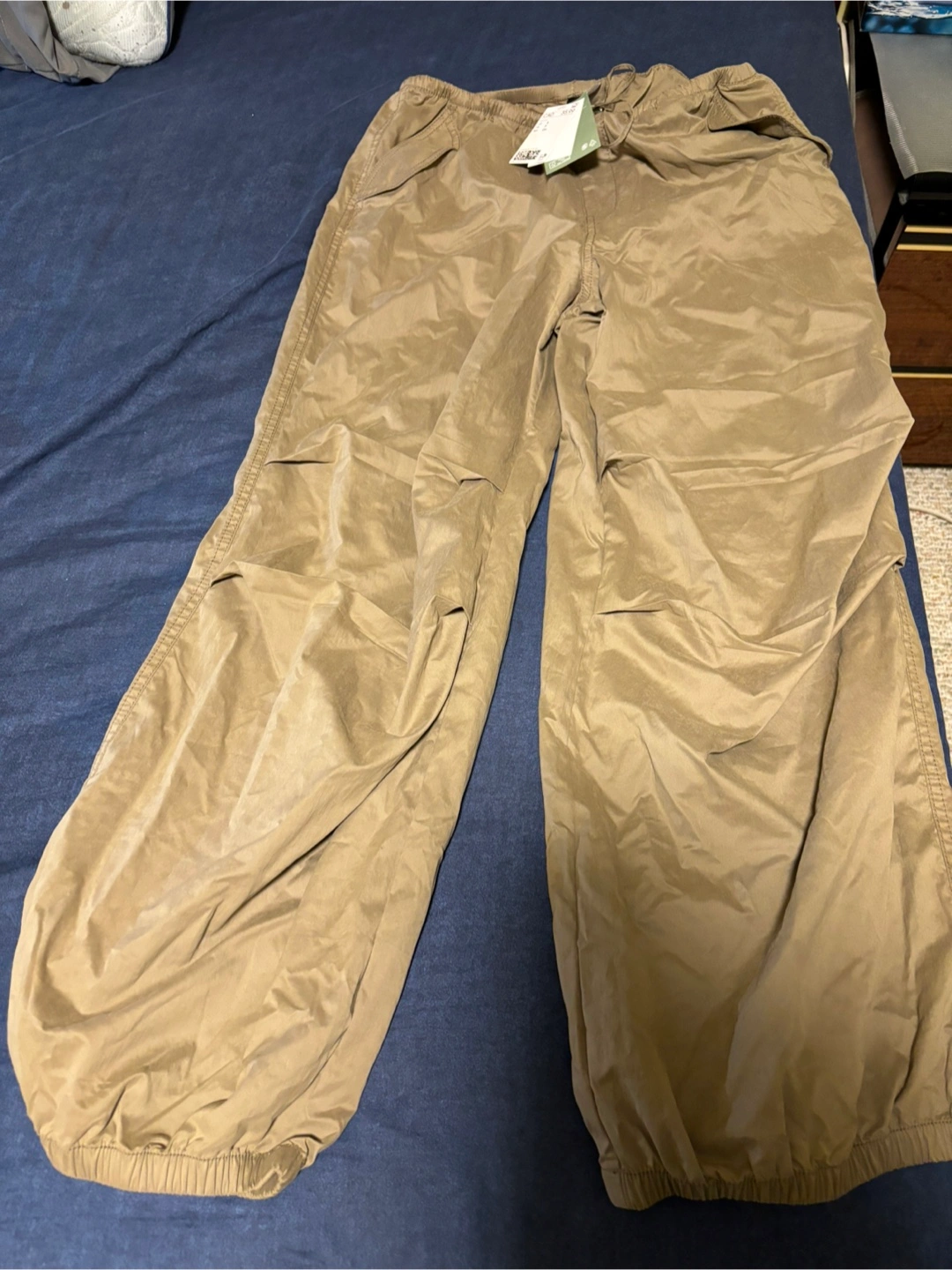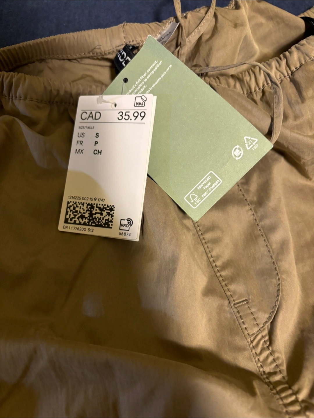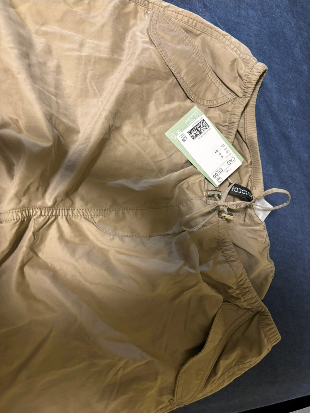 83Lightweight beige utility trousers. Elastic waistband with drawstring. Multiple pockets. Relaxed fit. Cuffed hems. Size small, but feels like M or L . Brand new with tags.