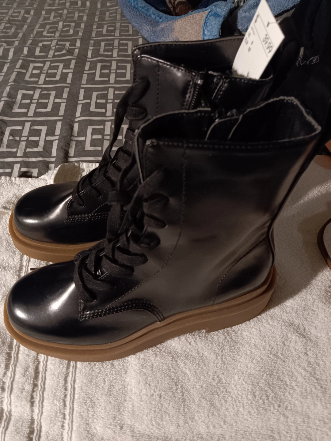 New black platform boots with laces. Size 6. Brown platform sole. Zipper closure on the side.