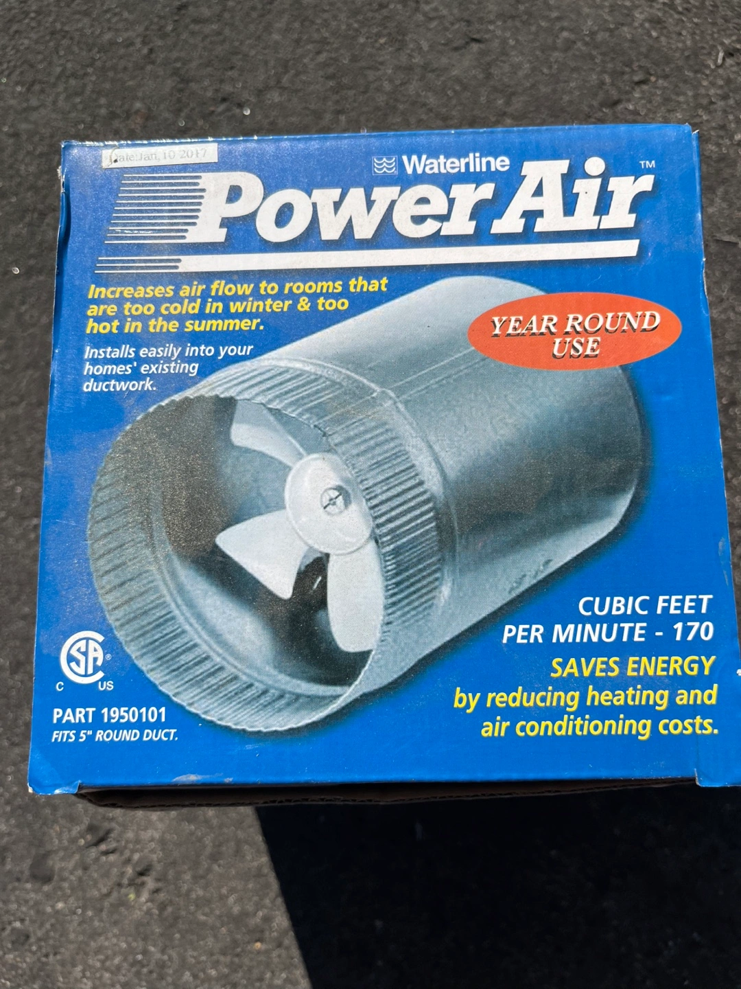 New inline duct fan. Fits 5" round duct. Increases air flow to rooms that get too cold in winter or too hot in summer. Installs easily into your home's existing ductwork. Saves energy by reducing heating and air conditioning costs. Part number 1950101.