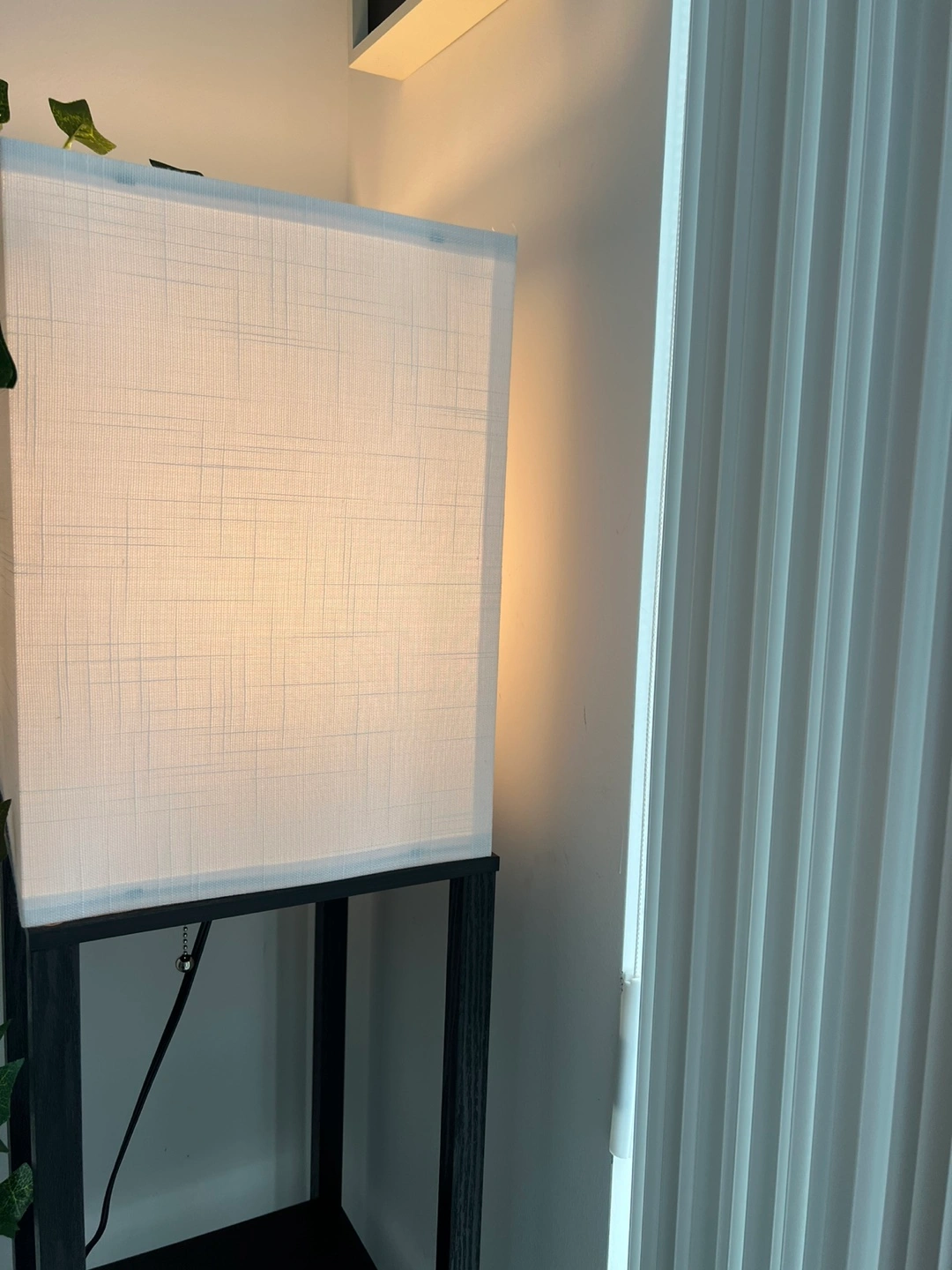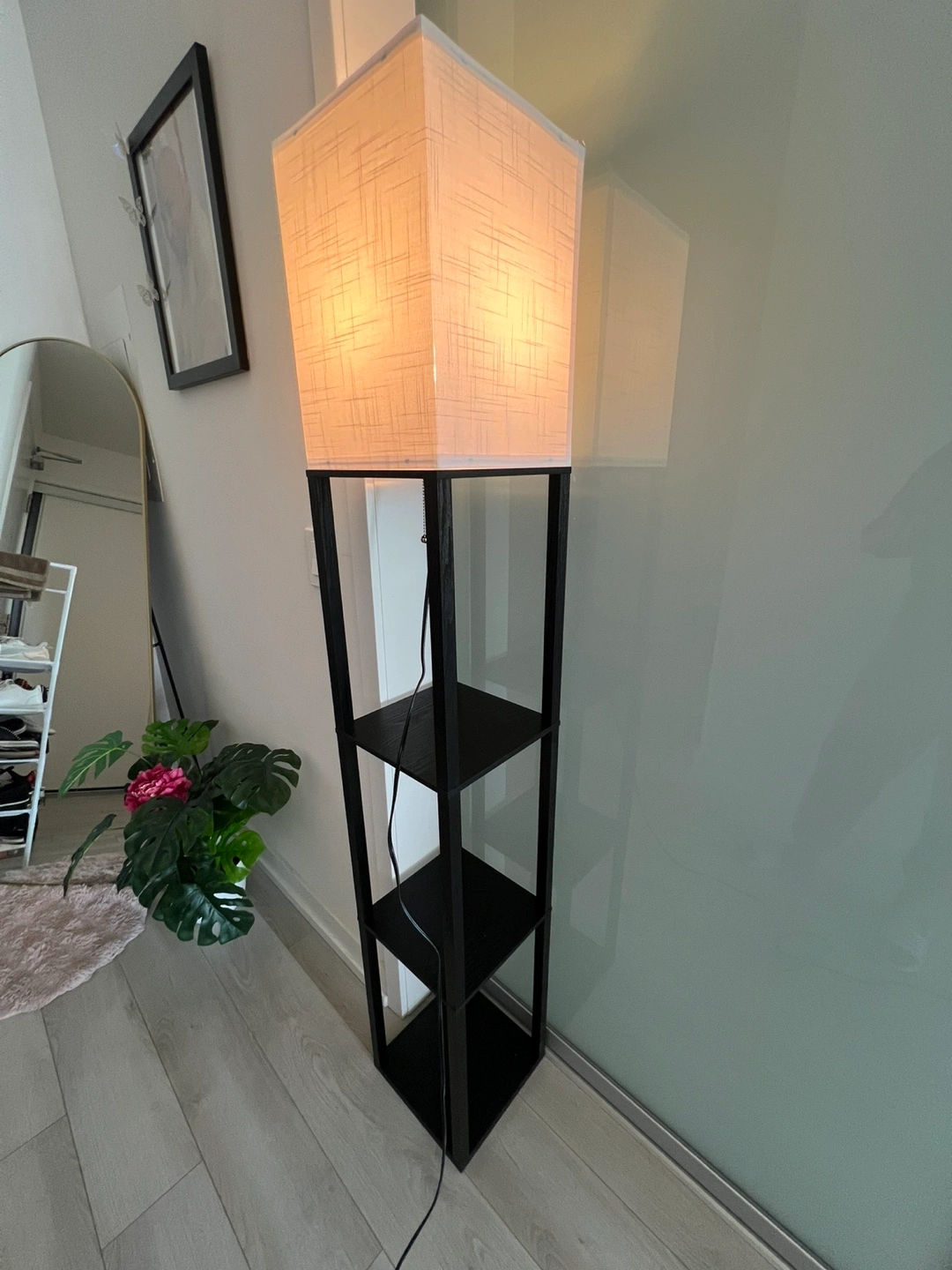 This used 4-tier lamp shelf is a stylish and functional lighting solution for any room. Featuring a sturdy black frame with four shelves and a white linen shade, this lamp provides ample lighting and storage space. This lamp has been gently used for a month and is in excellent condition, selling it because we’re moving out. Can be picked by 1 person, (light but strong)