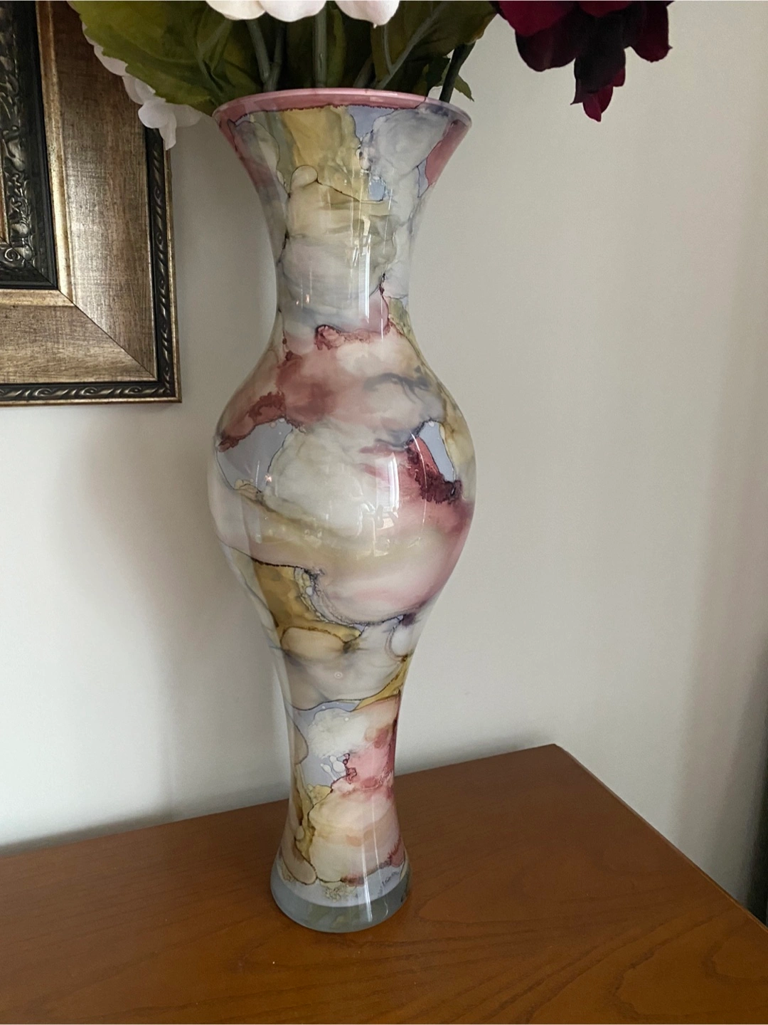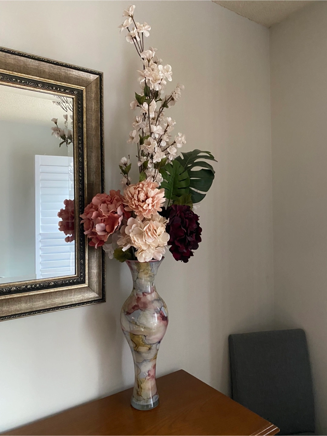 31Tall glass vase, coloured design. Purchased from Homesence. Contains artificial flowers; hydrangeas, peonies, and cherry blossoms. Perfect centerpiece. Pick up in Brampton.