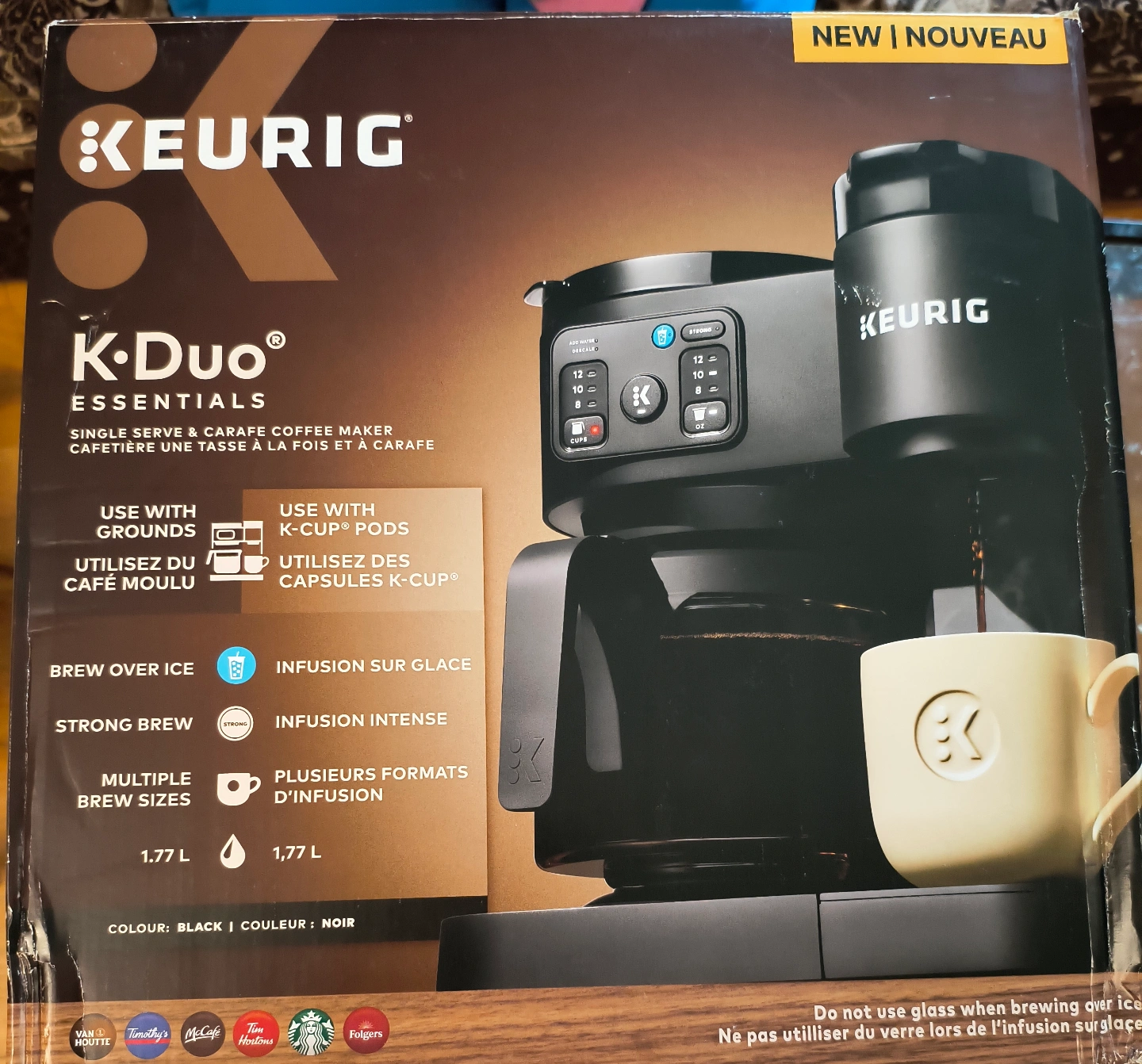 New in box. Single serve & carafe coffee maker. Brews K-Cup pods and ground coffee. Multiple brew sizes. Strong brew option. 1.77 L carafe.