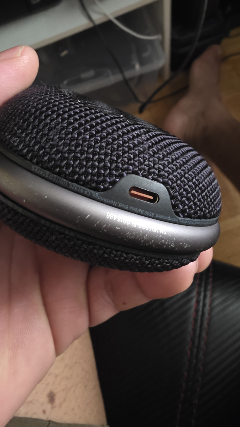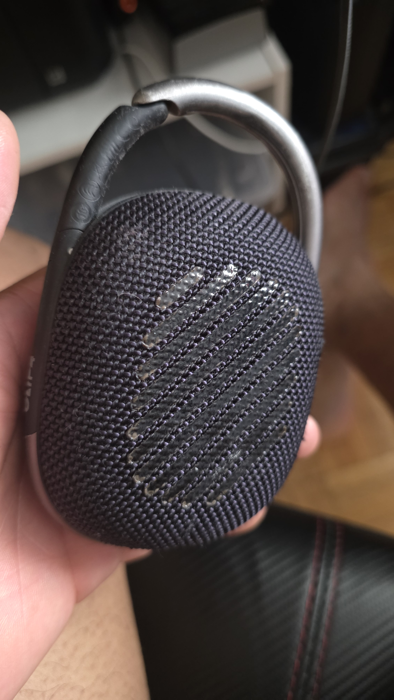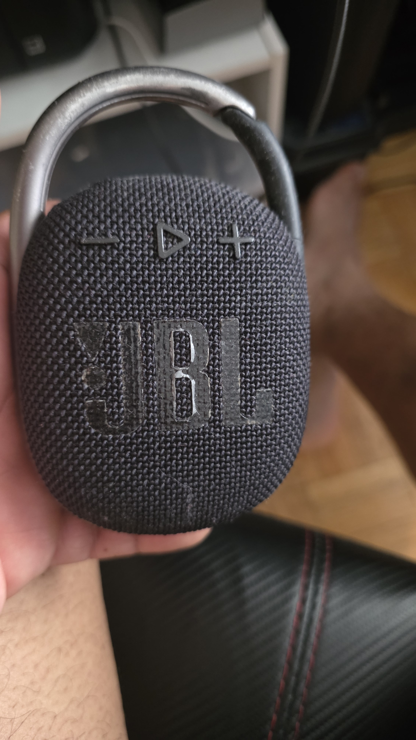 Portable Bluetooth speaker. Features a carabiner clip. Small and compact design. Shows some wear. I peeled off the rubber a few years ago due to parts of them already peeling, but it still sounds awesome. ive use it for a few months a year and a half ago, since then its just collecting dust