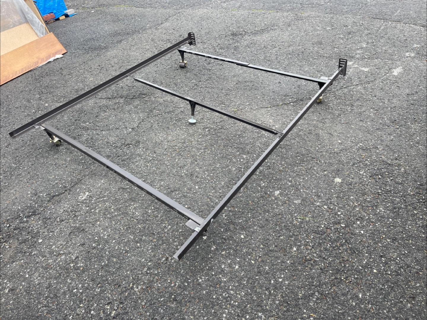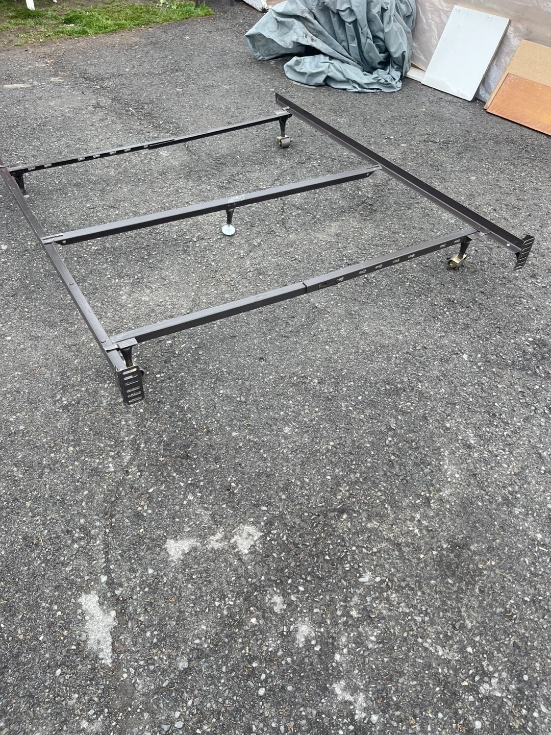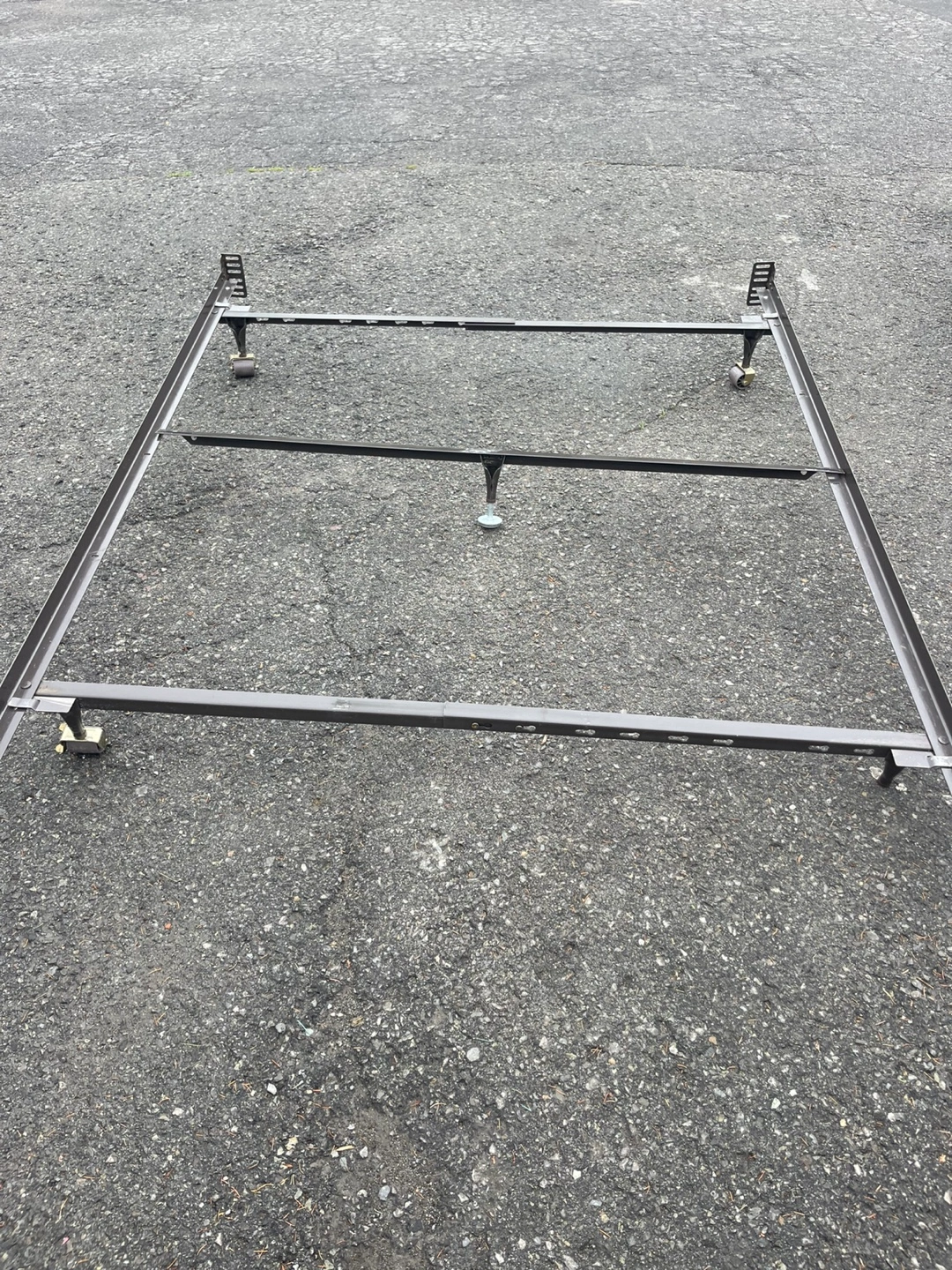 Metal bed frame, queen size. Dark brown colour. Includes centre support leg and four casters. Used, some minor wear.can be used twin and full size