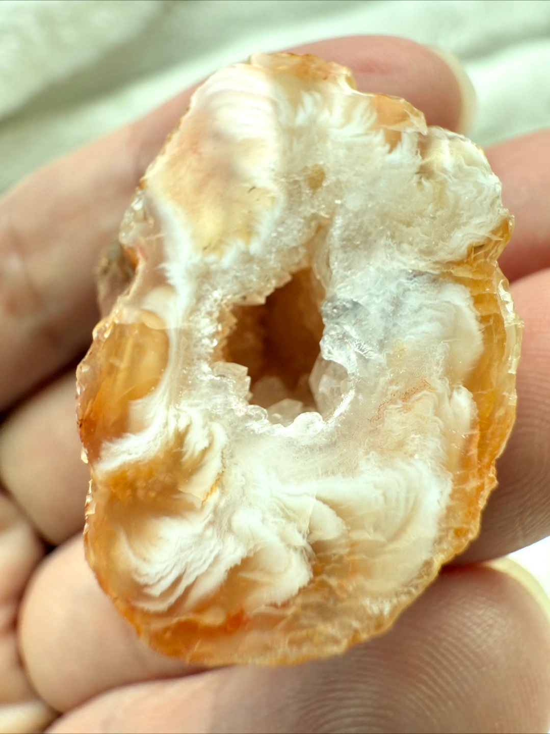 Stunning orange agate geode, sliced in half to reveal a hollow sparkly ✨ center and beautiful swirling patterns in warm shades of orange, white, and caramel.