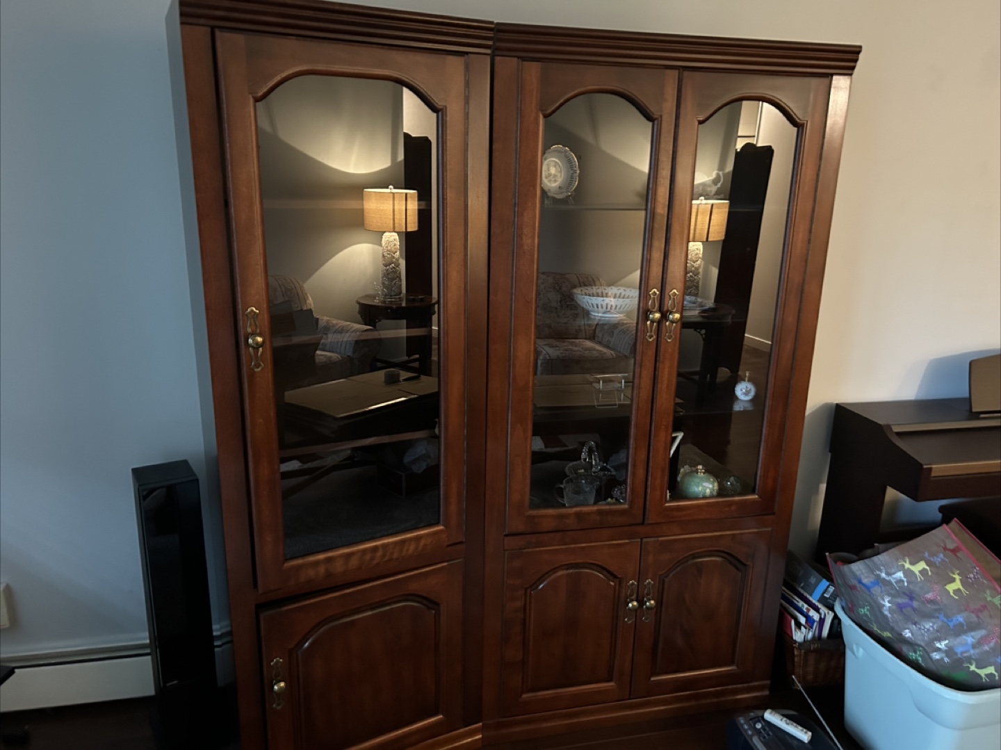 Clearing out my mom’s apt. Double curio cabinet. Dark wood finish. Glass doors . Need these picked up and gone by May 31st . I’m only available to meet May 31st to for pickup.