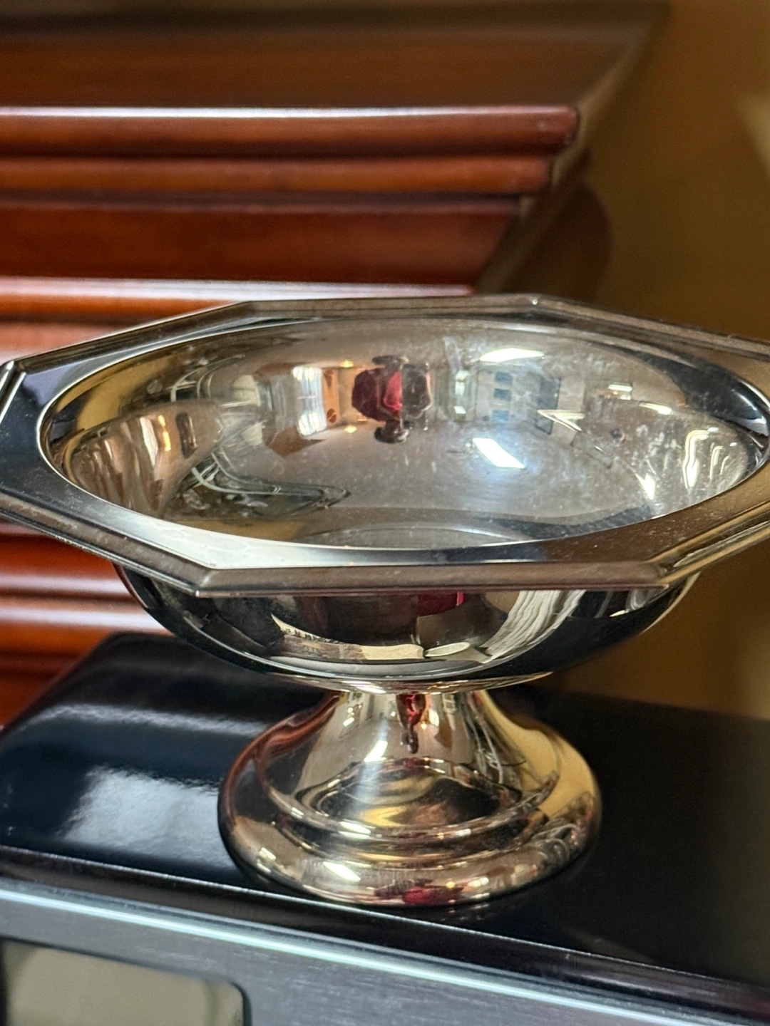 Small octagonal silver-plated bowl. Pedestal base. Elegant design. Perfect for candies or nuts.