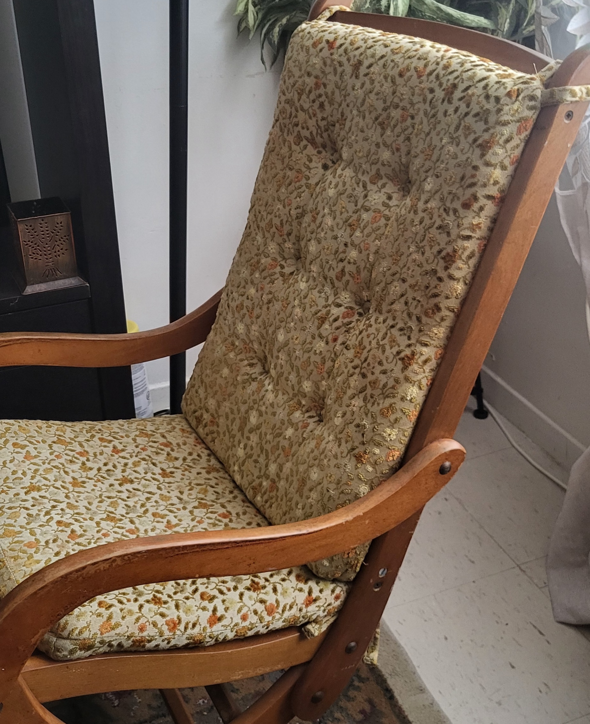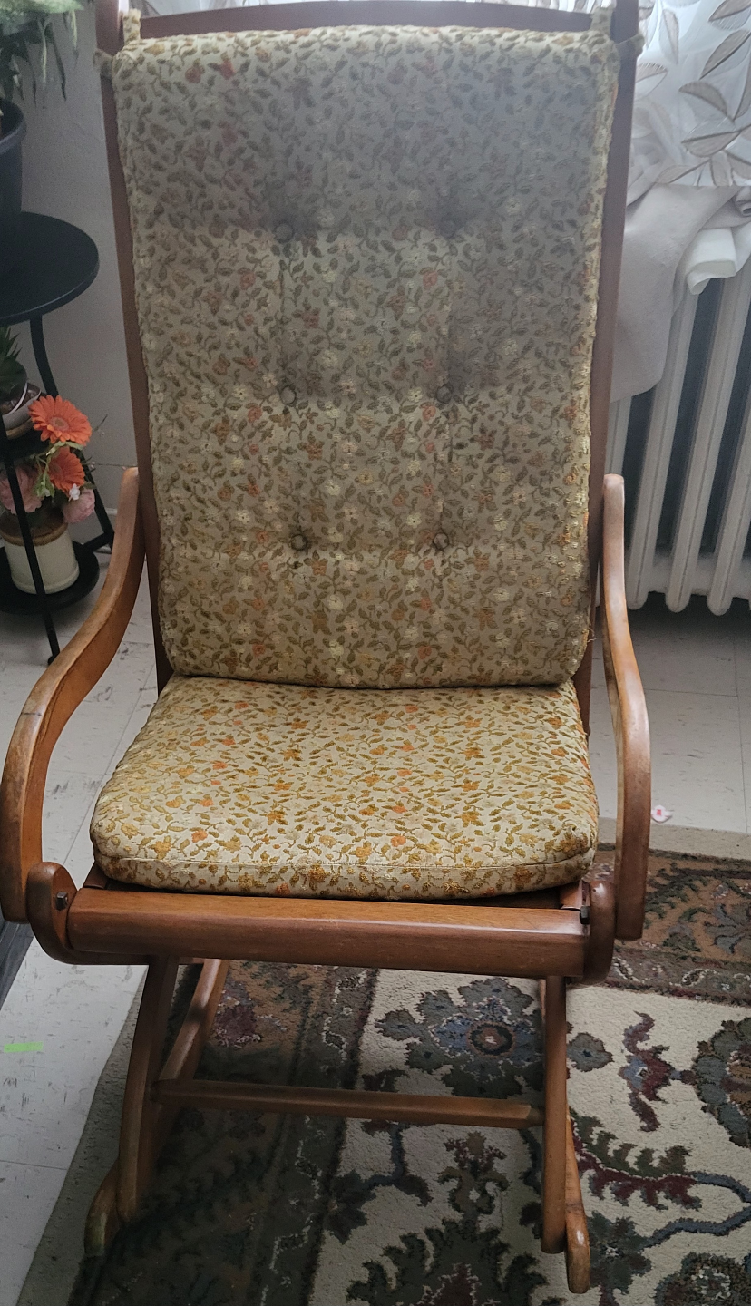 Comfortable rocking chair. Wooden frame. Floral patterned upholstery. Classic design. Suitable for living room or bedroom.
