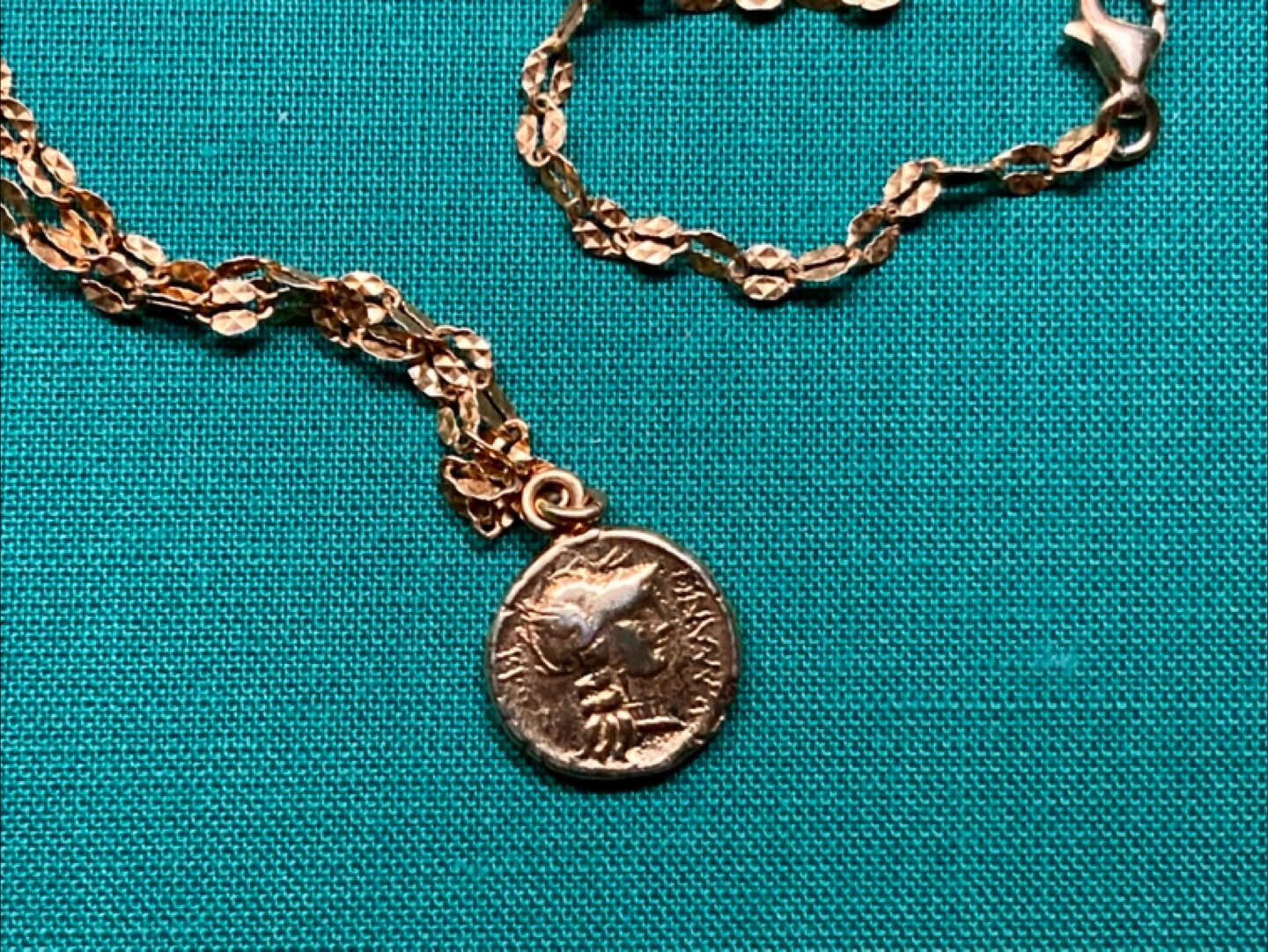 Gold plated silver chain with a Roman coin charm. Different images on either side of the coin (face on one side, looks like horses on the other). Coin is 1/2” diameter, chain is a very unique textured link style. Great for layering with other chains. Extender allows it to go between 15 to 16 1/2 inches long. Stamped 925 Italy. Pick up in the Ossington and Davenport area.