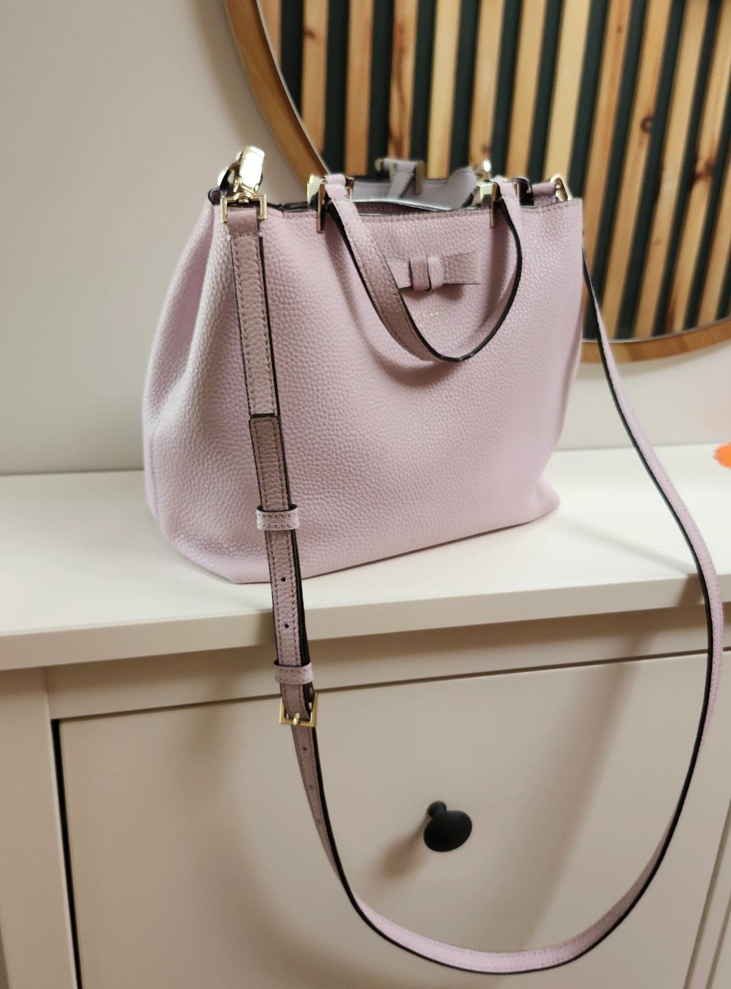 Lovely light purple leather handbag. Features two top handles and a detachable shoulder strap. Gold-toned hardware accents. Zip closure. Interior pockets.