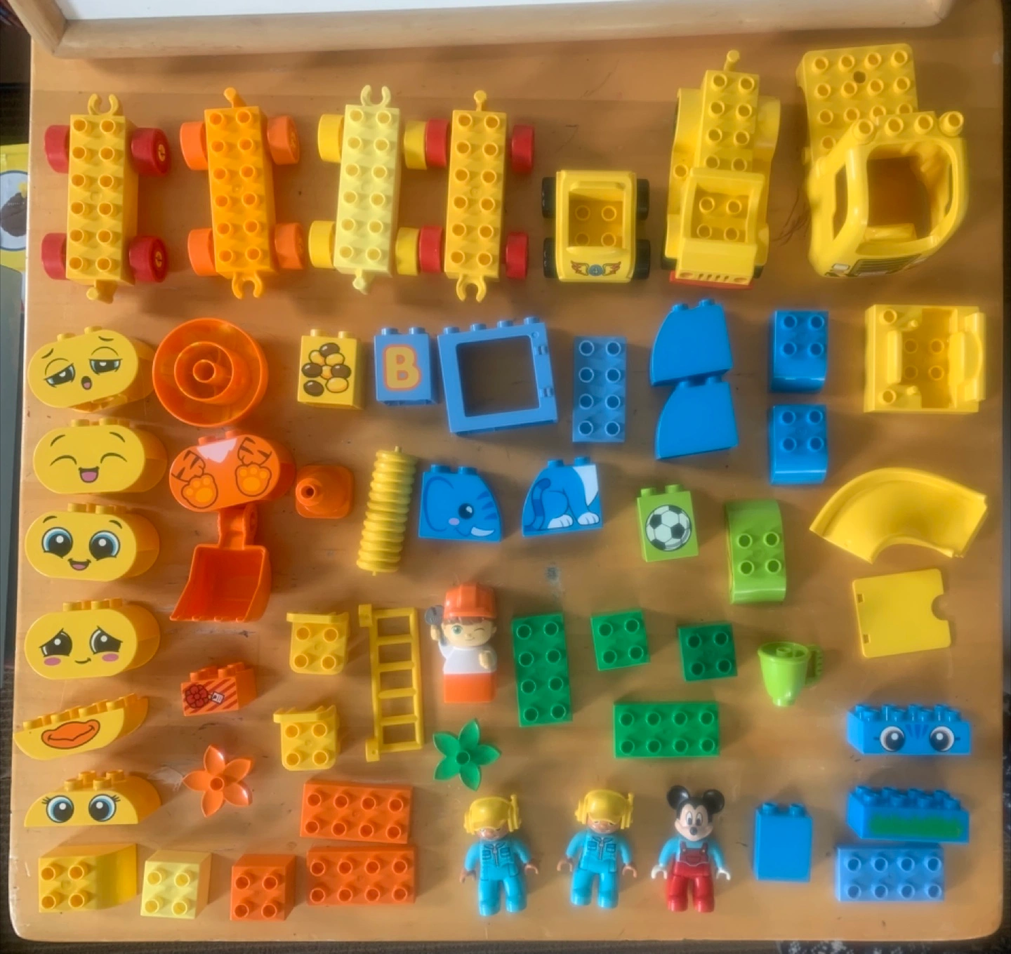 168Many colourful DUPLO blocks, including various shapes and sizes. 58 pieces. Several character figures included: Mickey Mouse, construction workers, and others. Vehicles and accessories also present. Great for imaginative play. Pick up at Eglinton Ave east at Bayview.