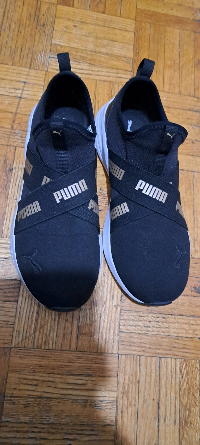 Black slip-on Puma sneakers. Gold Puma logo accents. Softfoam cushioned insole. Great for casual wear.