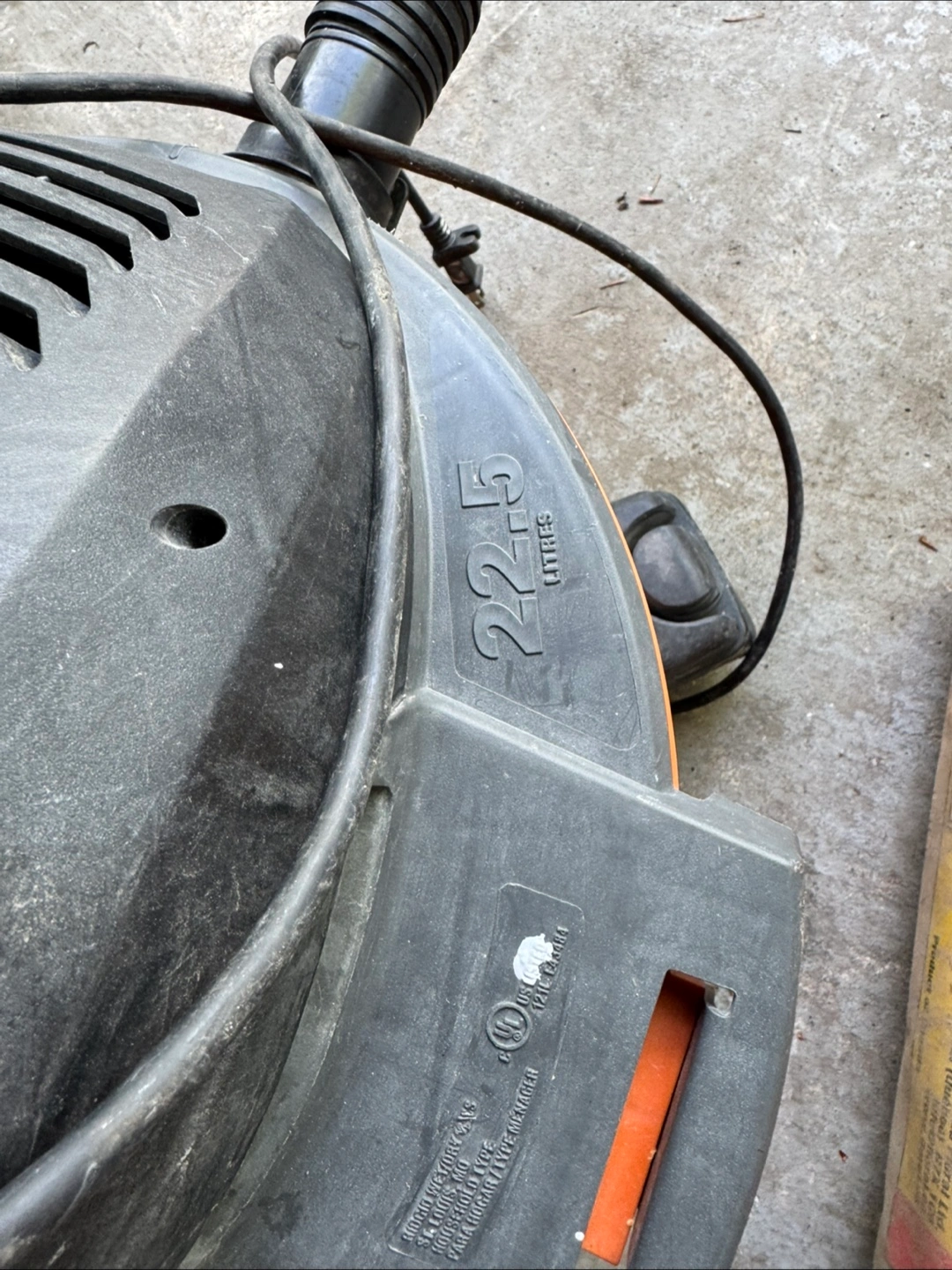 11Used RIDGID wet/dry vac. 22-litre capacity. Includes hose and floor nozzle. Shows some wear.