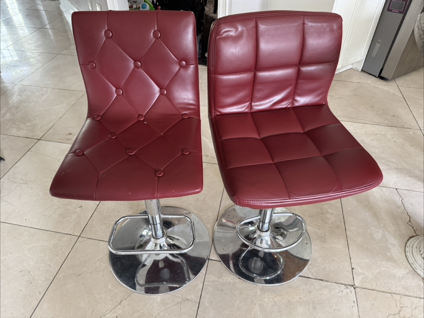 1 / 41 / 4Buy & SellThree Bar Stools - Red and BlackThree Bar Stools - Red and Black$60Set of three bar stools. Two are burgundy and one is black. Adjustable height. Chrome base. Some wear and tear.WHERE TO MEETWoodbrigeView MapSELLERAlexandriaWoodbridge110 reviews1 chats·0 favorites·20 viewsSEND CHAT TO SELLERHi Alexandria! I’m interested in your listing.Hi Alexandria! I’m interested in your listing.Get the Karrot app to chatSign In to chat