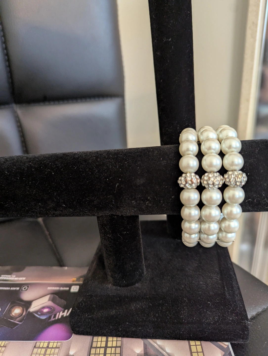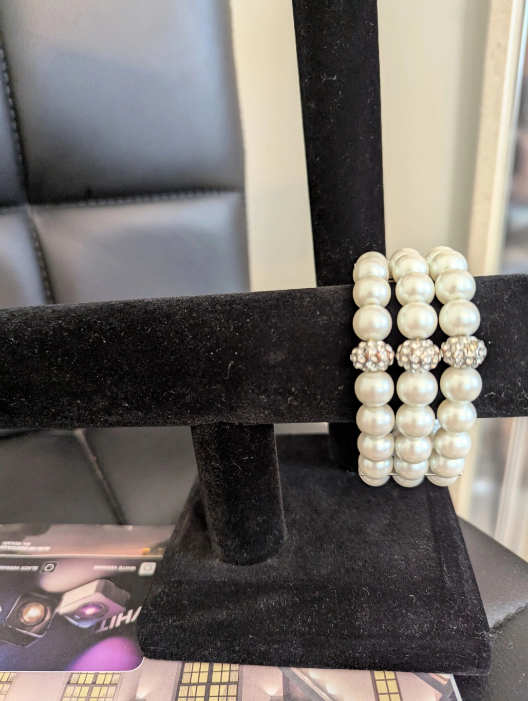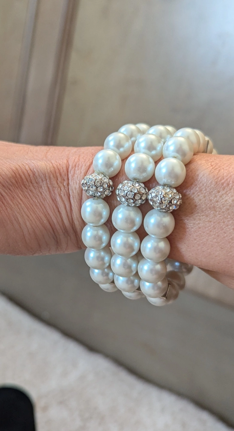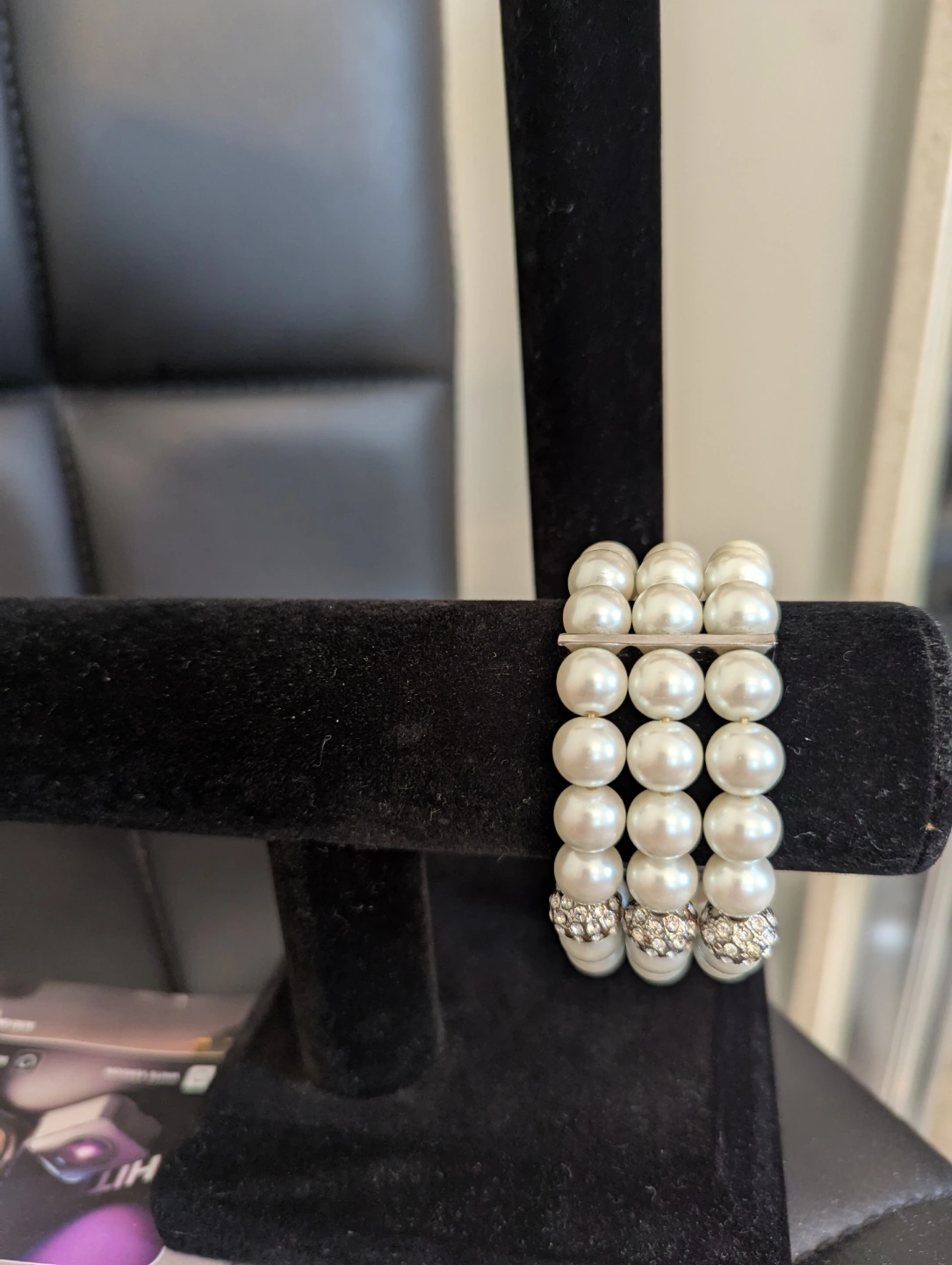 Elegant triple strand bracelet. Features lustrous faux pearls and sparkling rhinestone accents. Perfect for adding a touch of sophistication to any outfit. Great for weddings or special occasions.