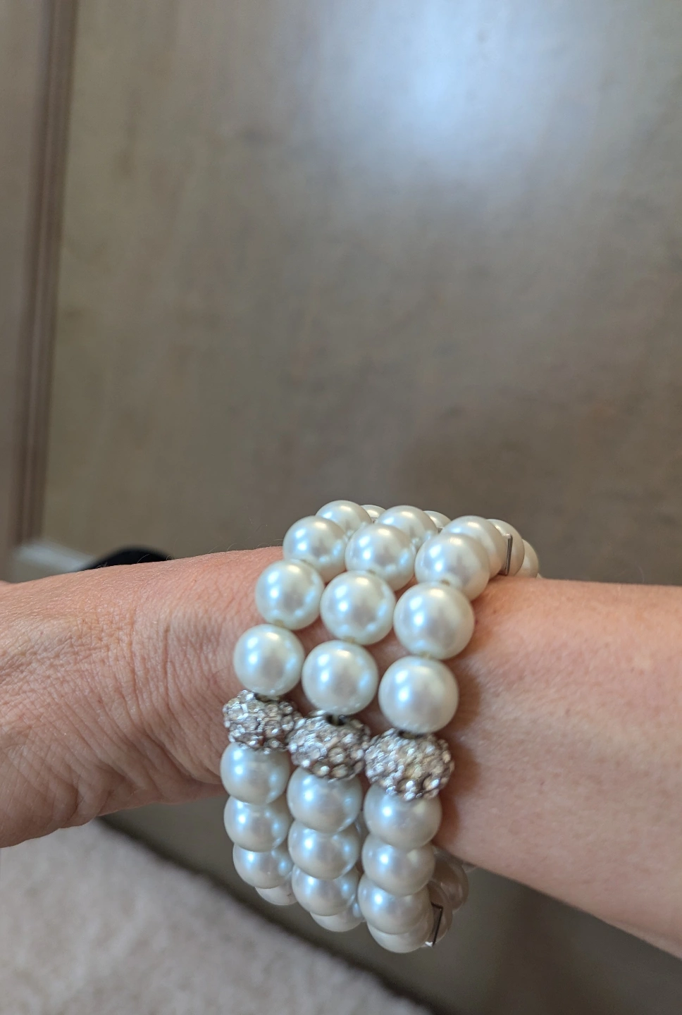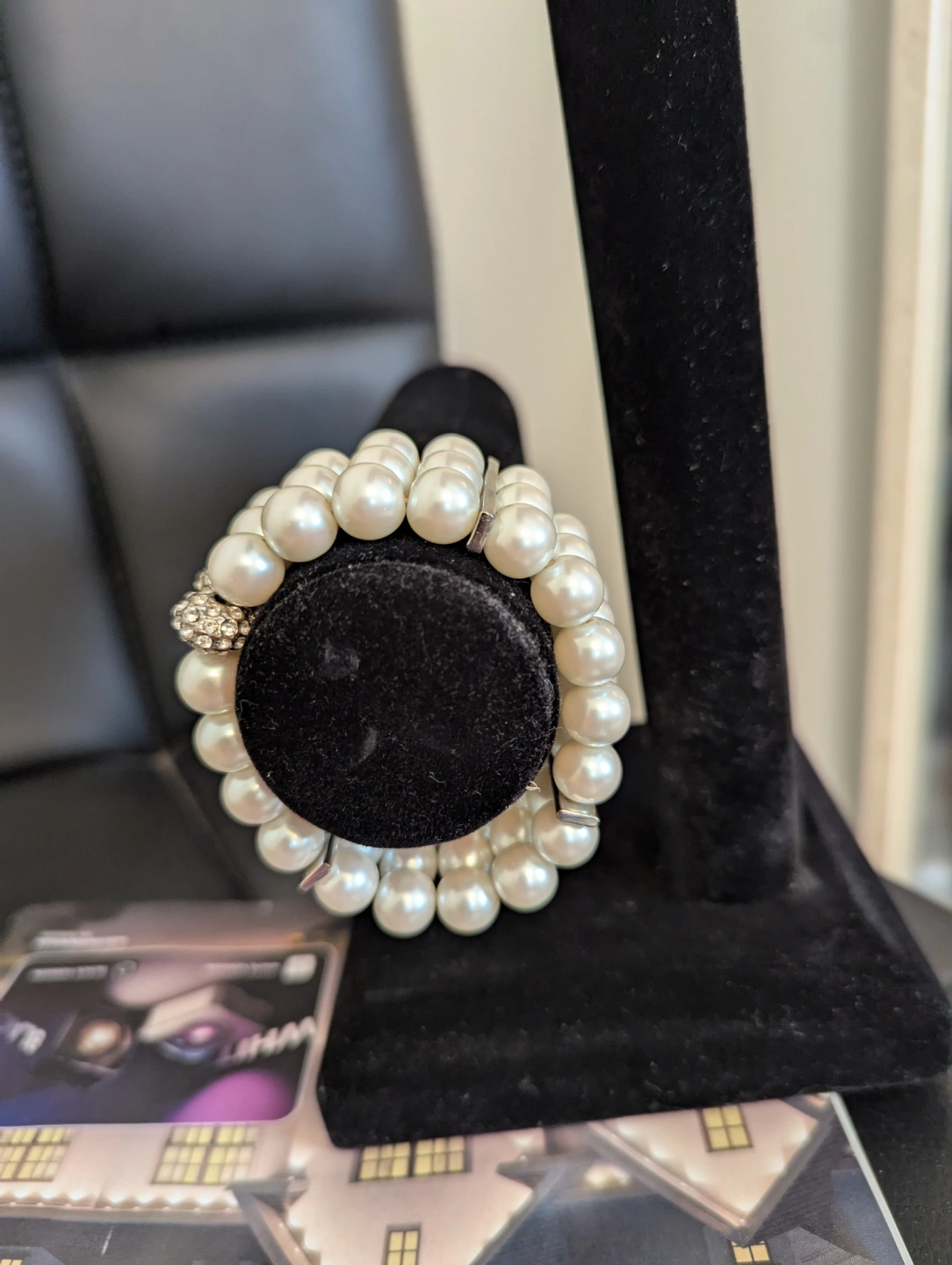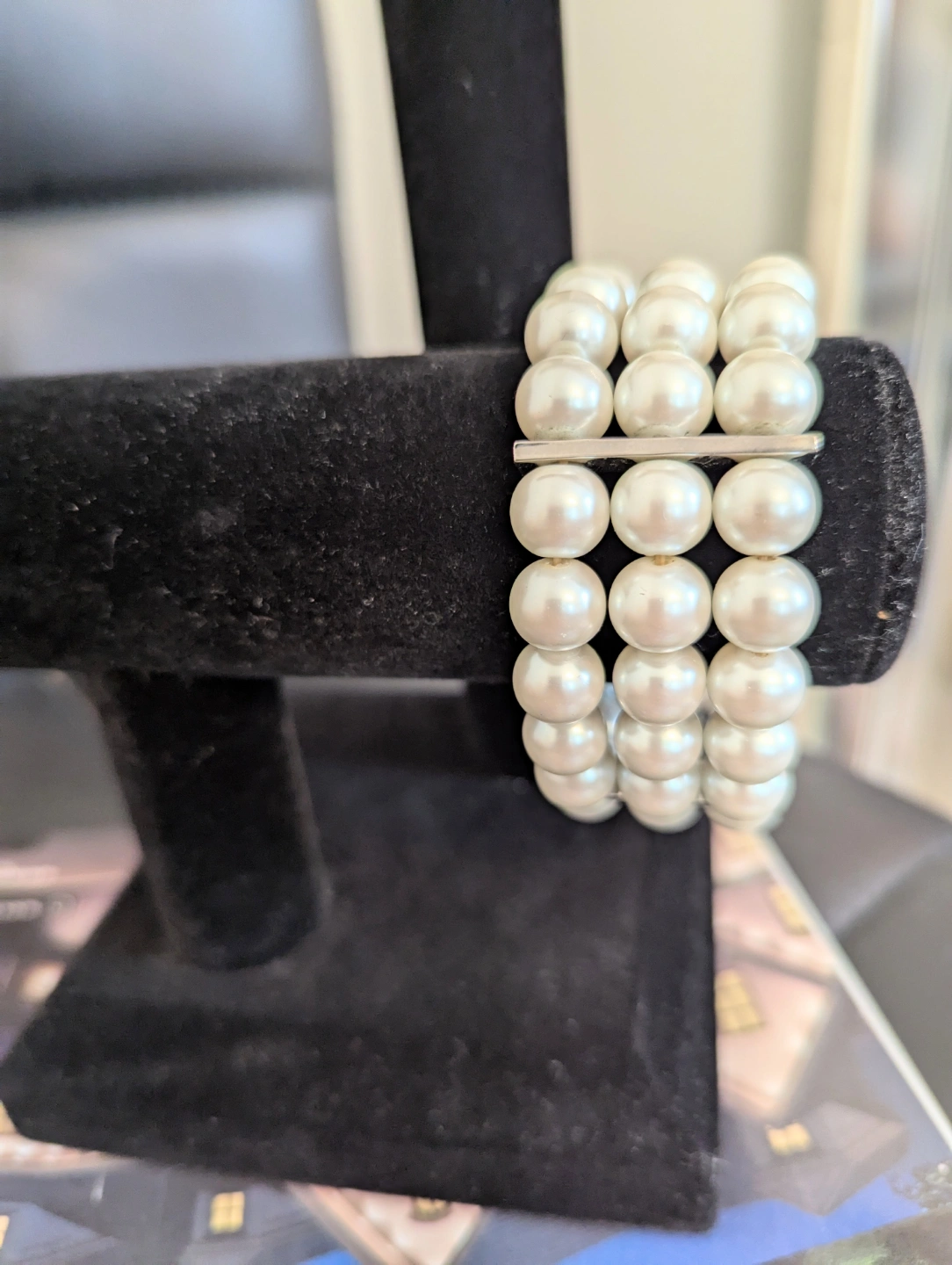 Elegant triple strand bracelet. Features lustrous faux pearls and sparkling rhinestone accents. Perfect for adding a touch of sophistication to any outfit. Great for weddings or special occasions.