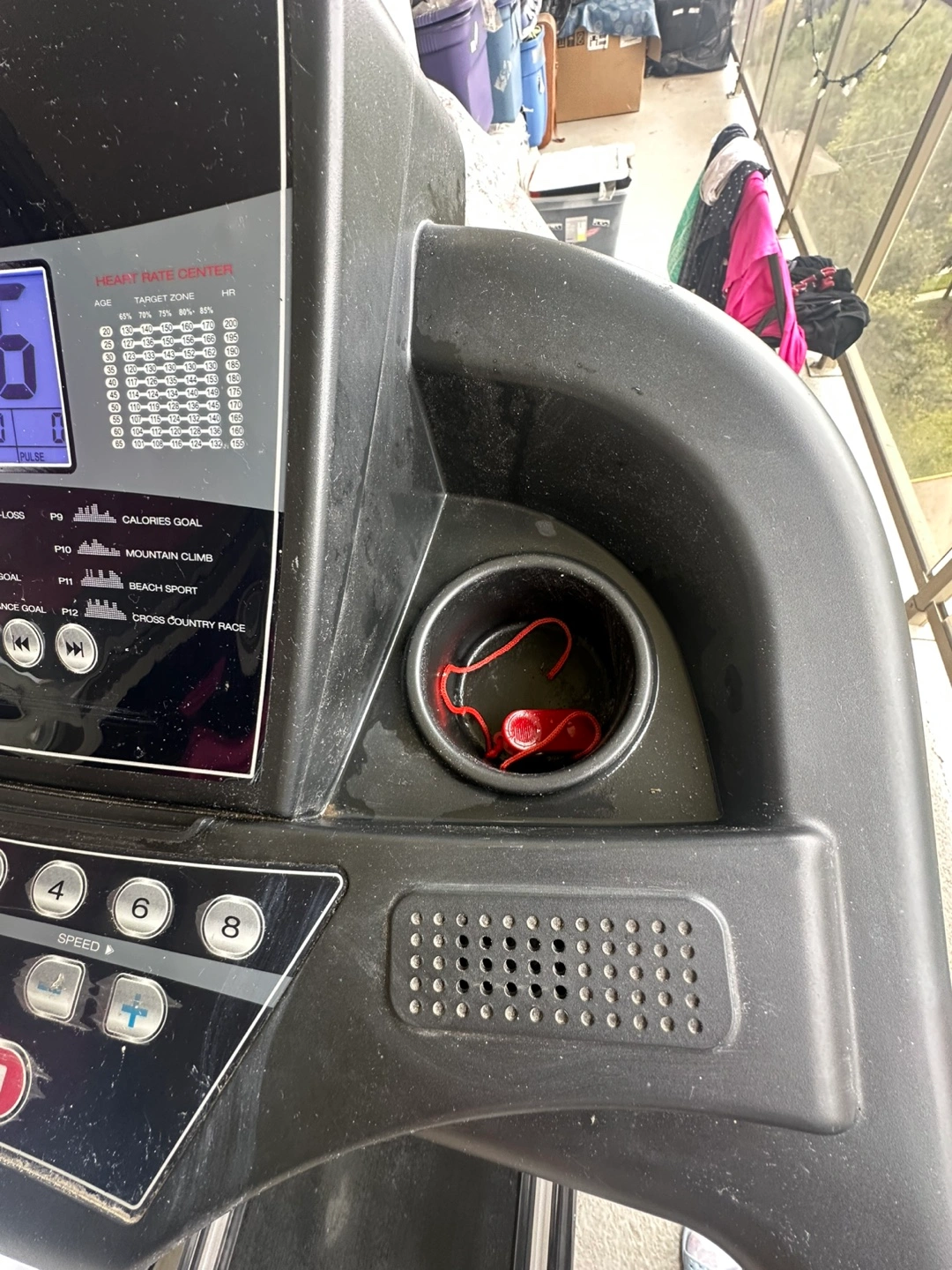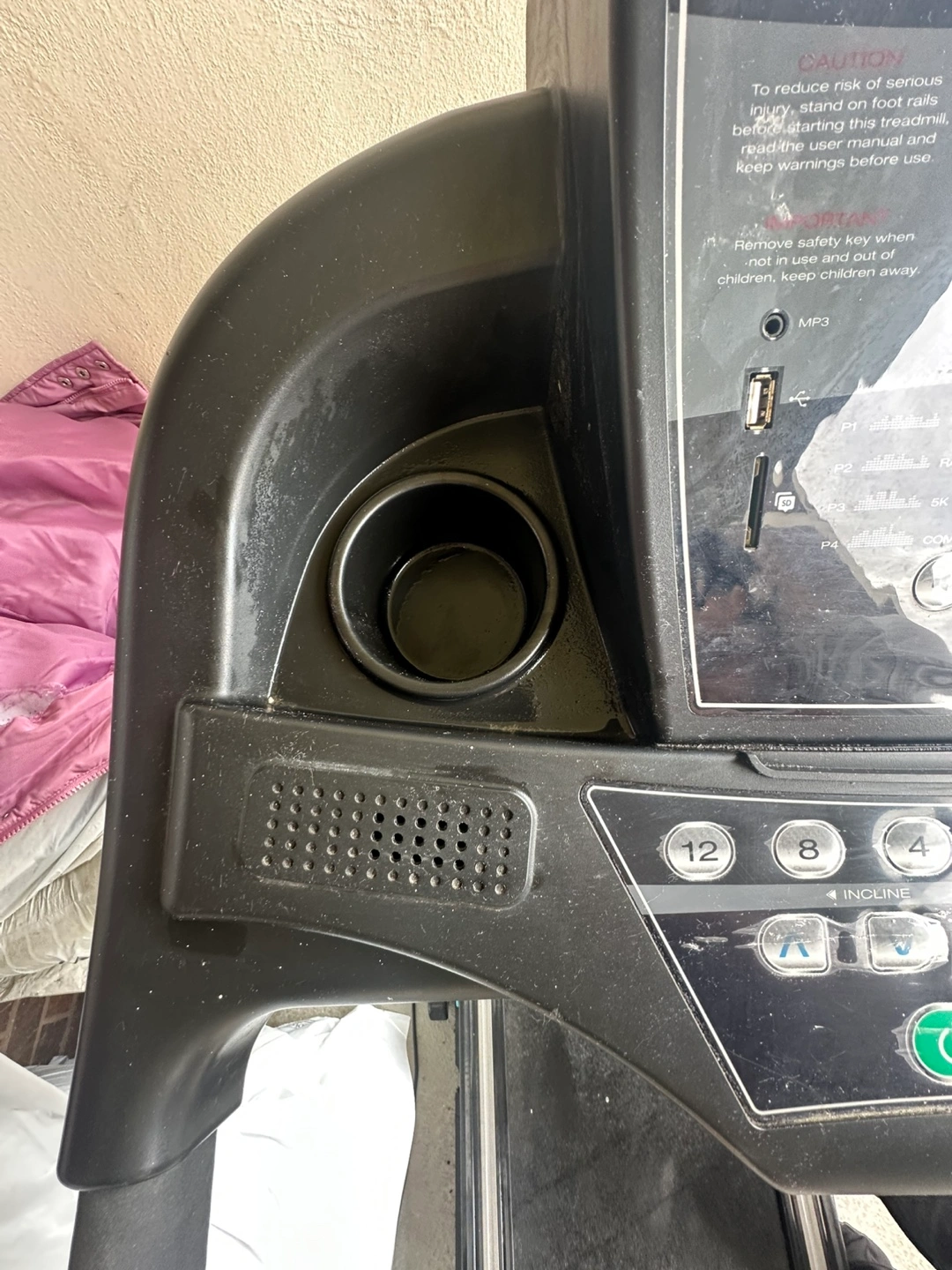 Foldable functional treadmill. Features a digital display, not too sure how the program function works and has an incline function. Includes safety key and cup holders. Wear and tear evident please see pictures.