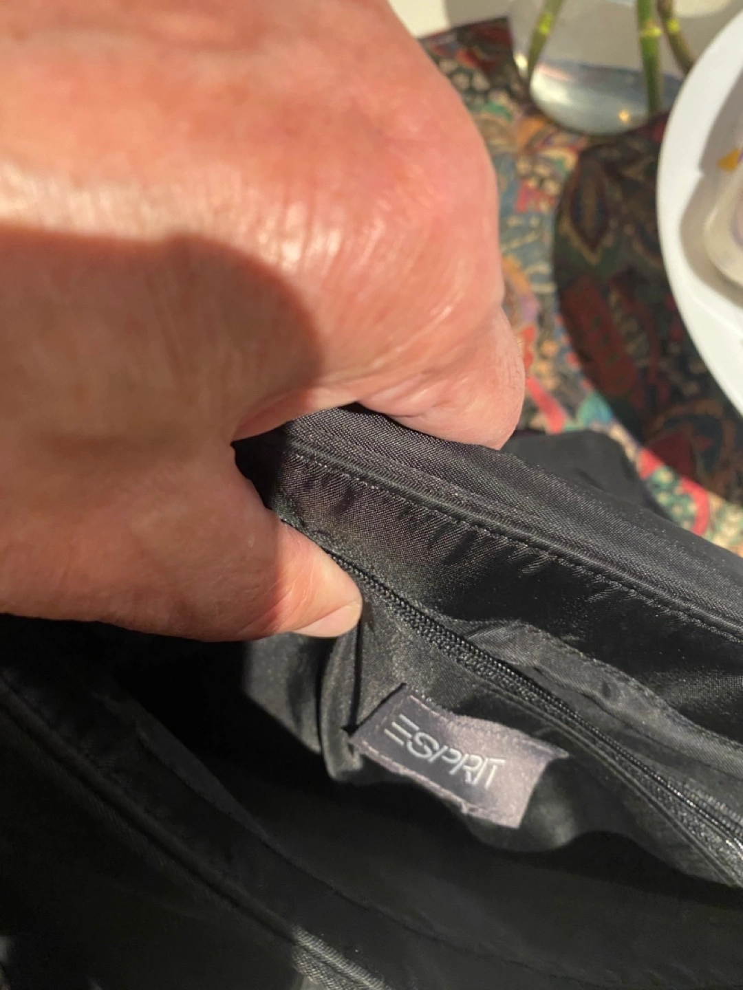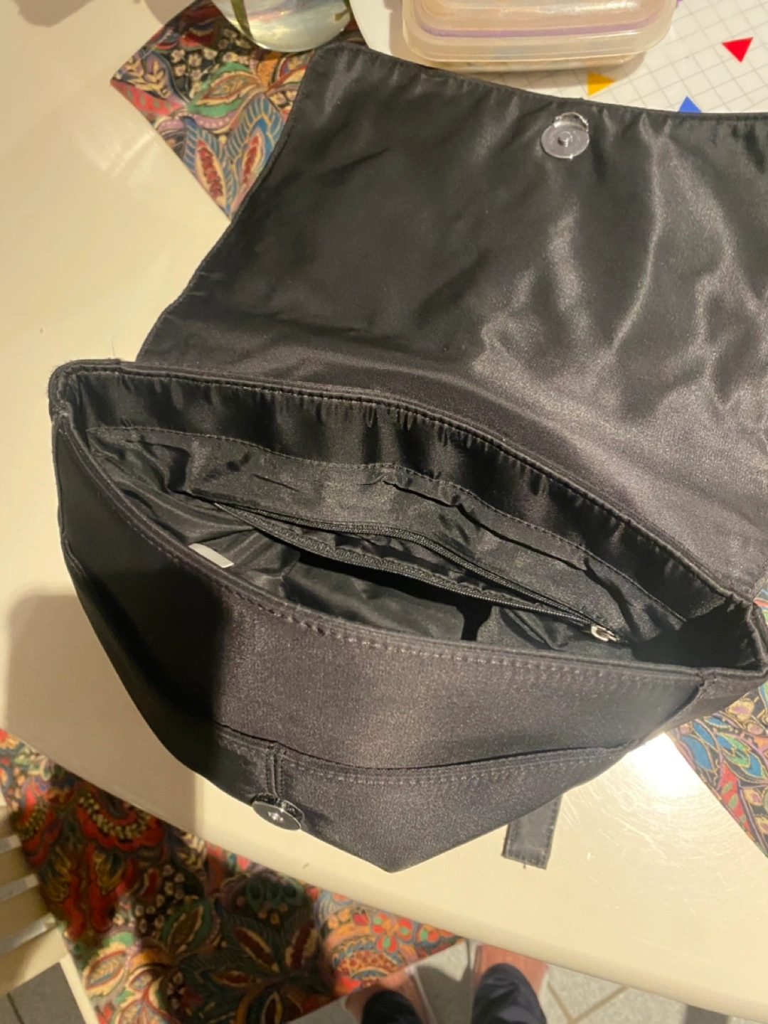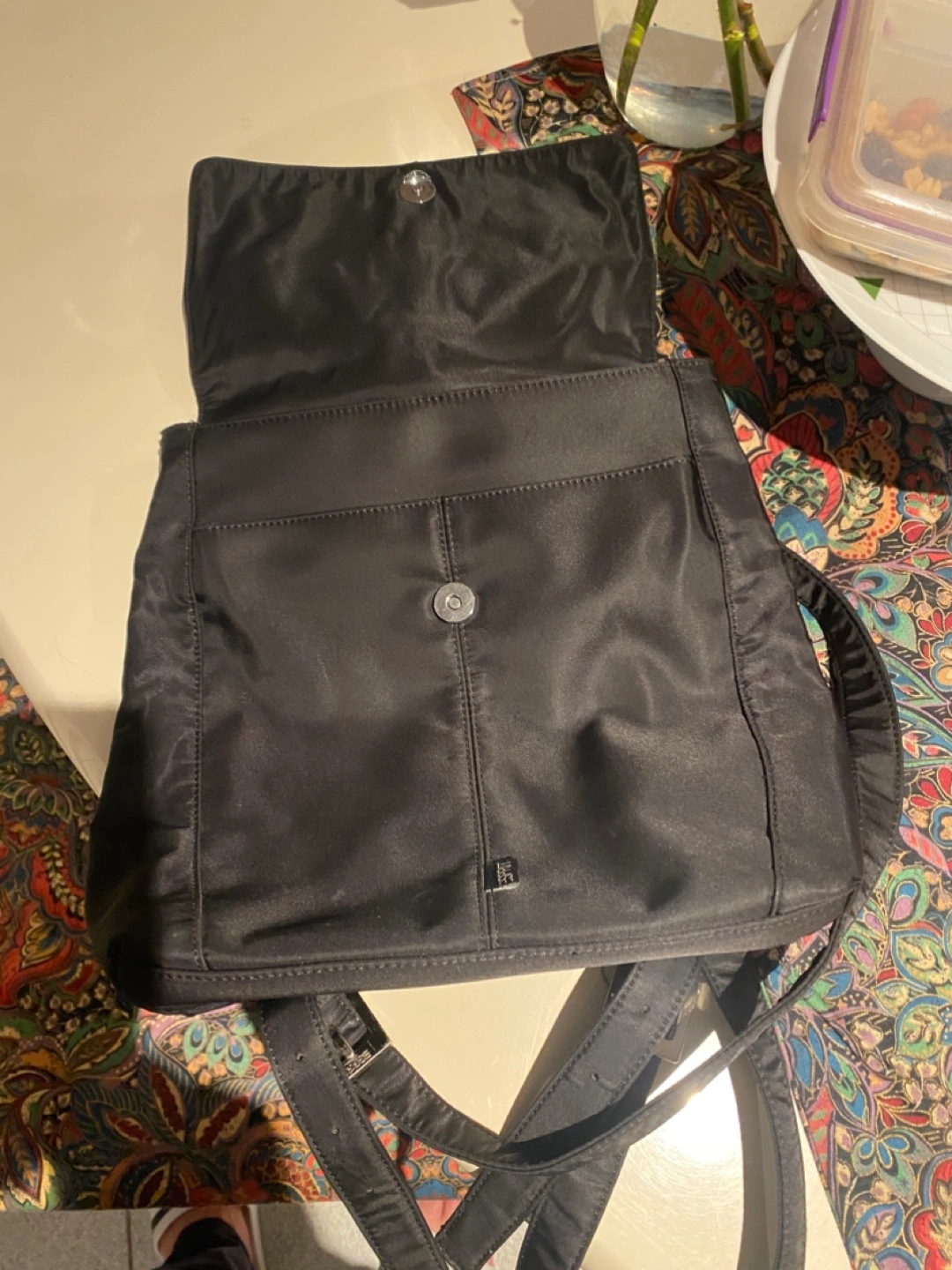 Black backpack. Multiple compartments. Adjustable straps. Small, lightweight.
