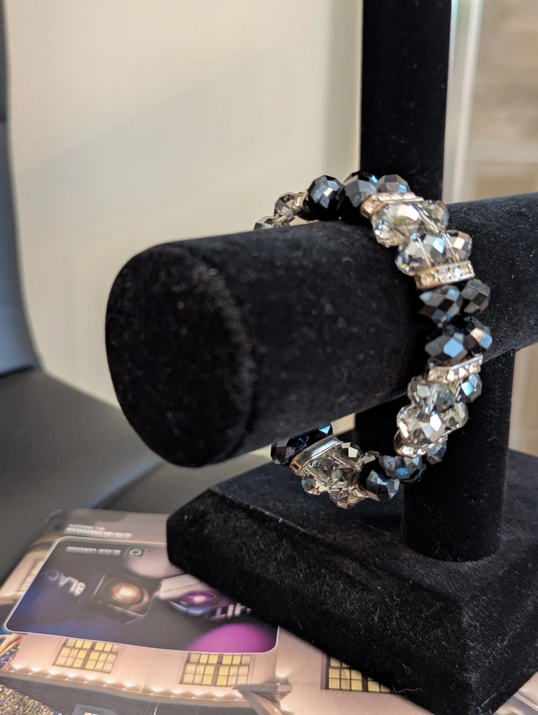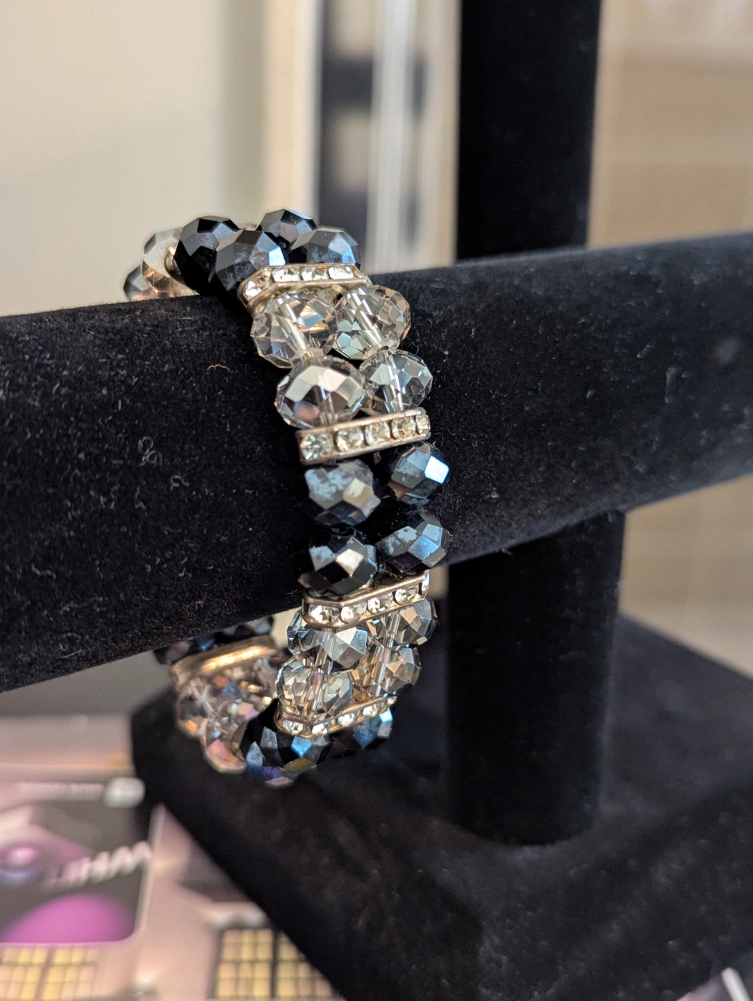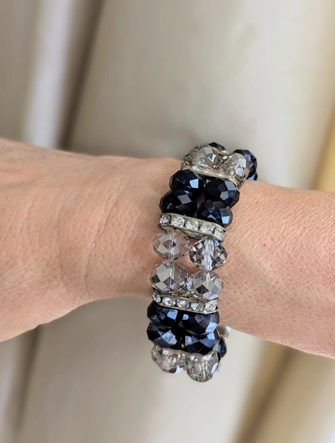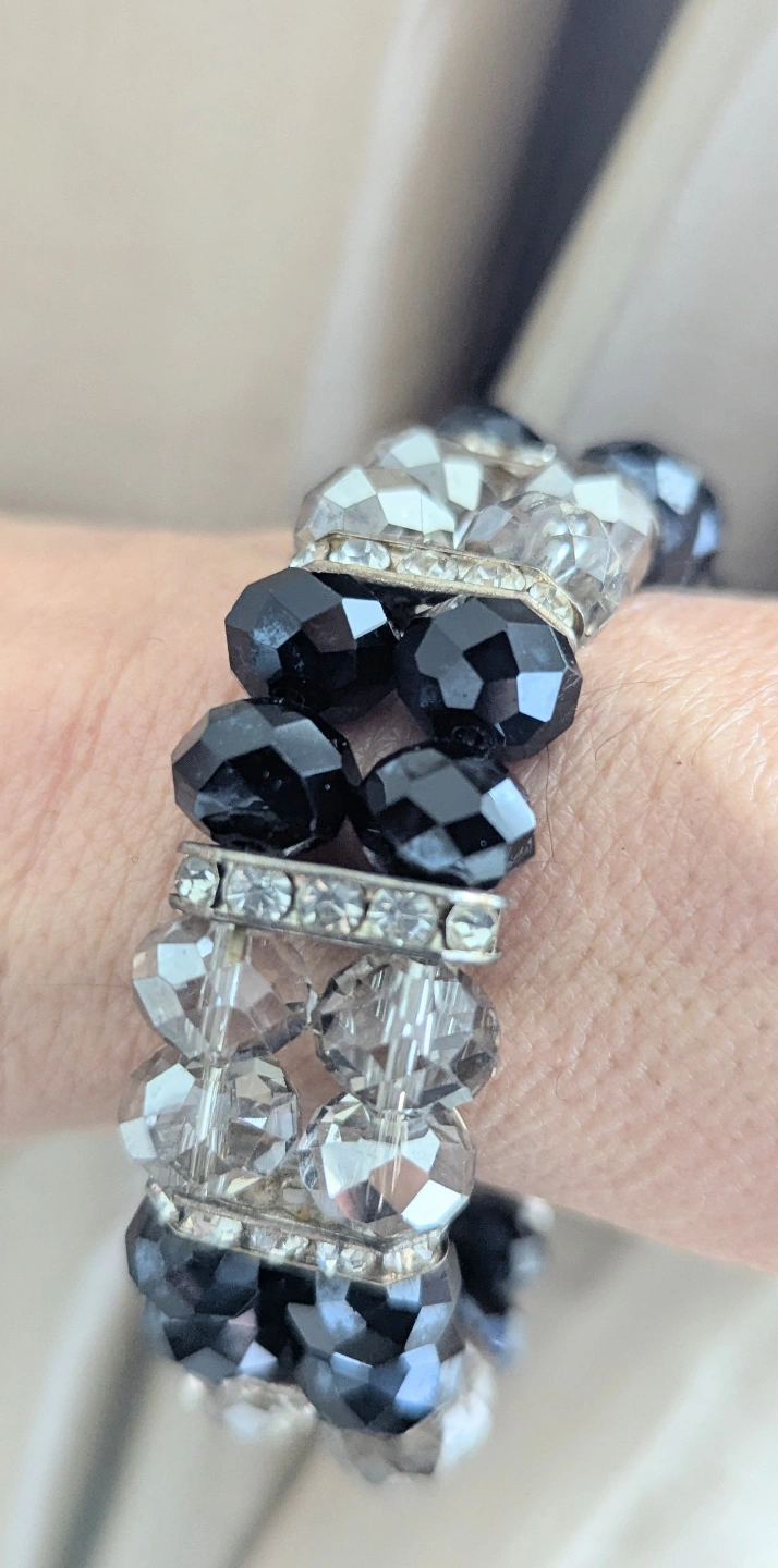 Stunning bracelet. Features faceted black and clear crystals spaced with rhinestones panels. Stretchy design, easy and comfortable wear. Adds a touch of sparkle to any outfit.