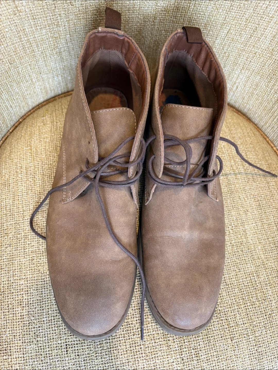 This was worn once. Pair of men's brown suede chukka boots. Lace-up closure. Brown laces. Rubber sole. Good condition.