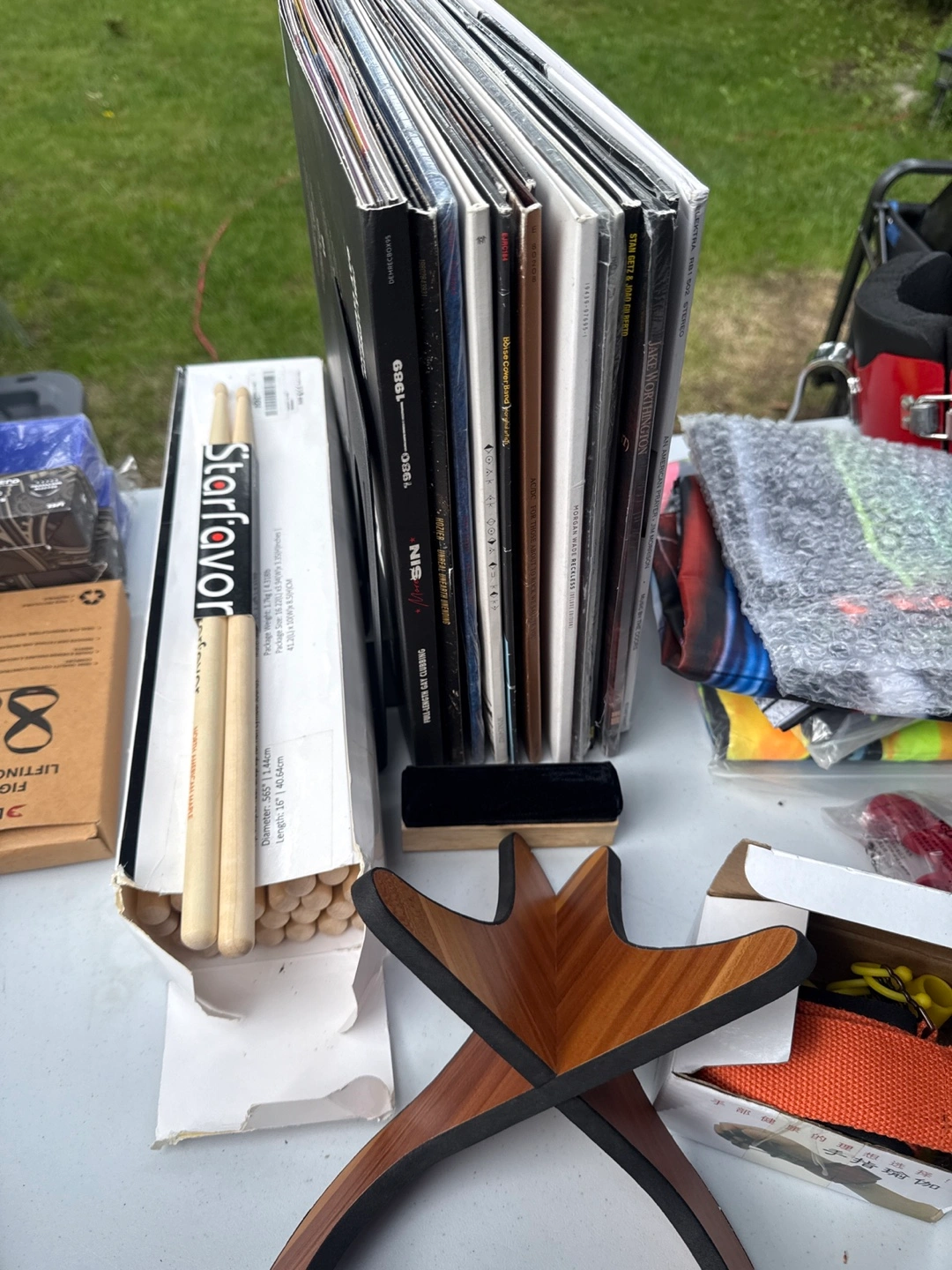 18Large collection of vinyl records. Includes Starfavor drumsticks.Guita stand ,tell me which one you like,good deal for everyone