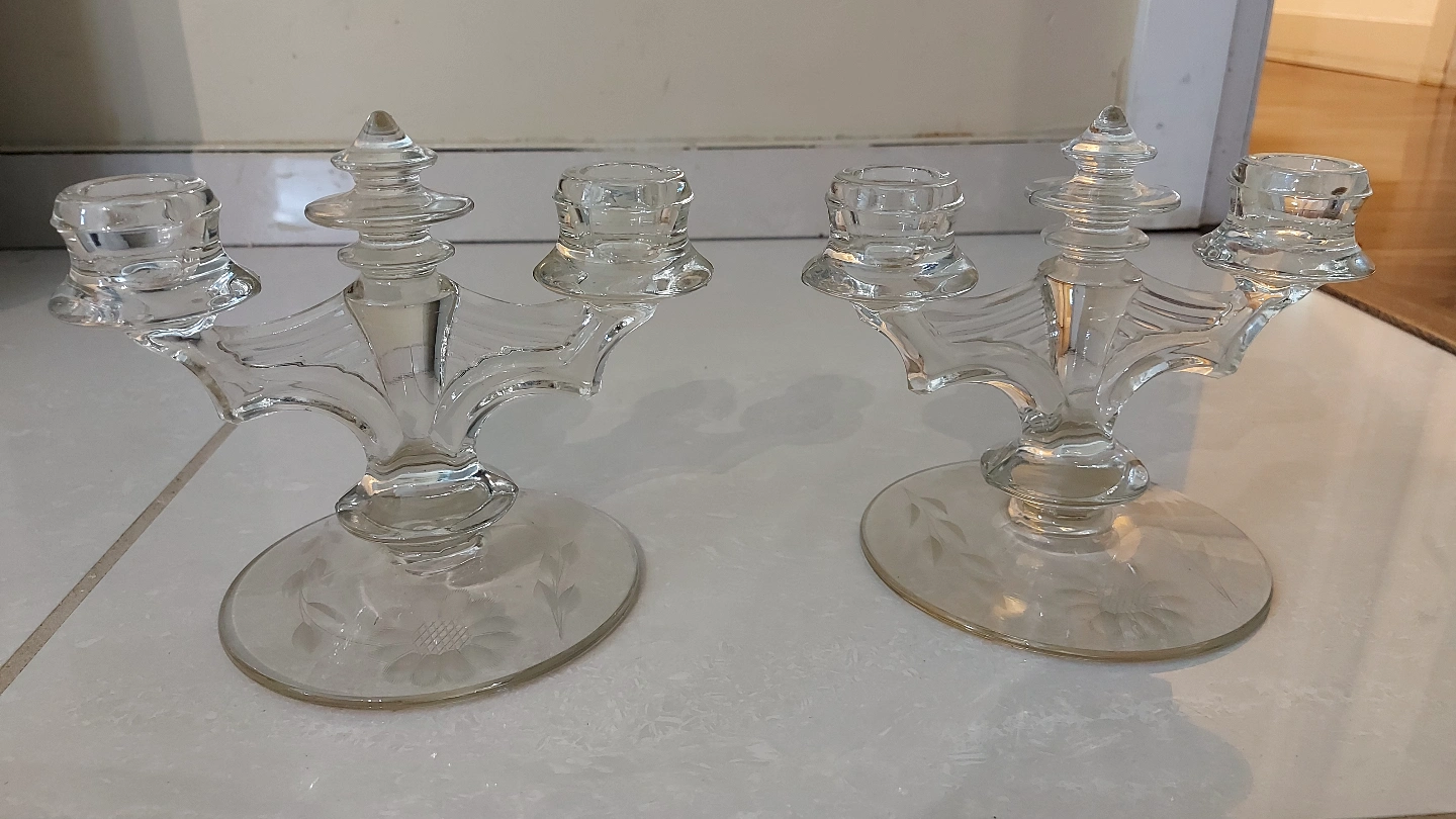 Elegant pair of crystal candle holders. Two candle holders per piece. Etched floral details on the base. Perfect for adding a touch of vintage charm to your home.