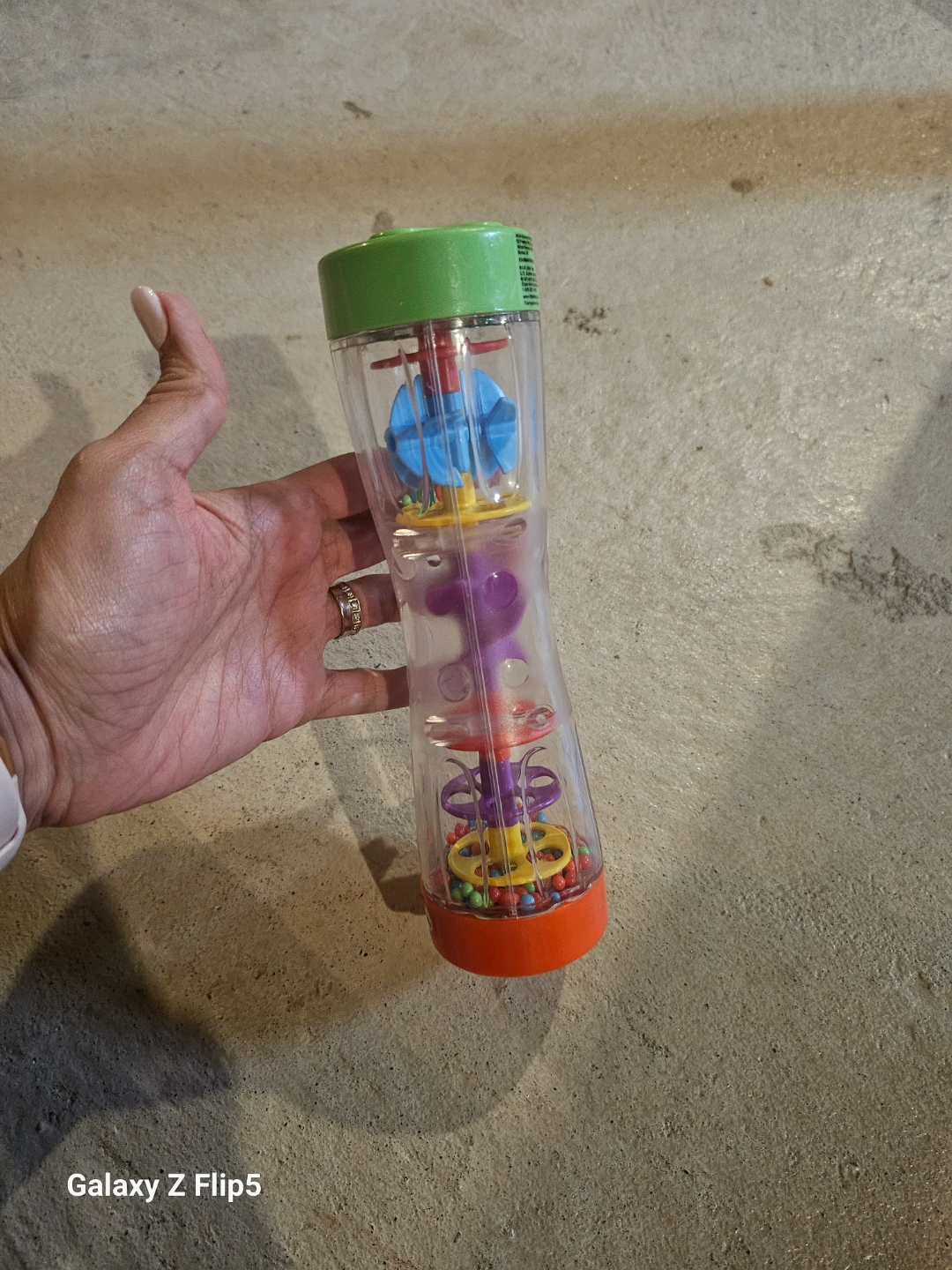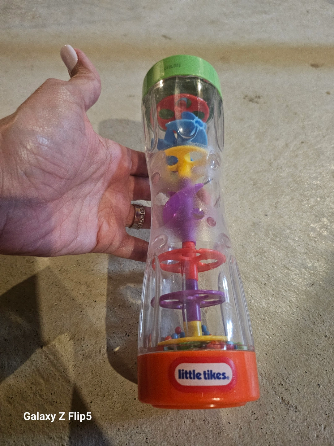 Colorful baby toy. Features multiple spinning parts and colourful beads. Great for sensory development. Clear plastic tube with orange and green coloured ends.