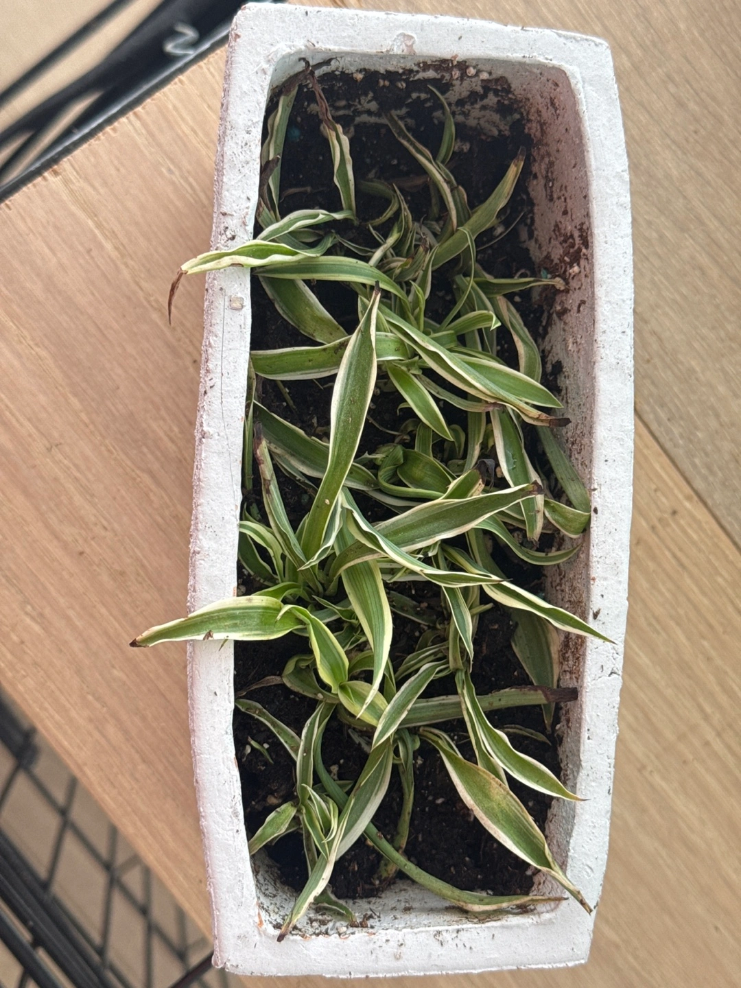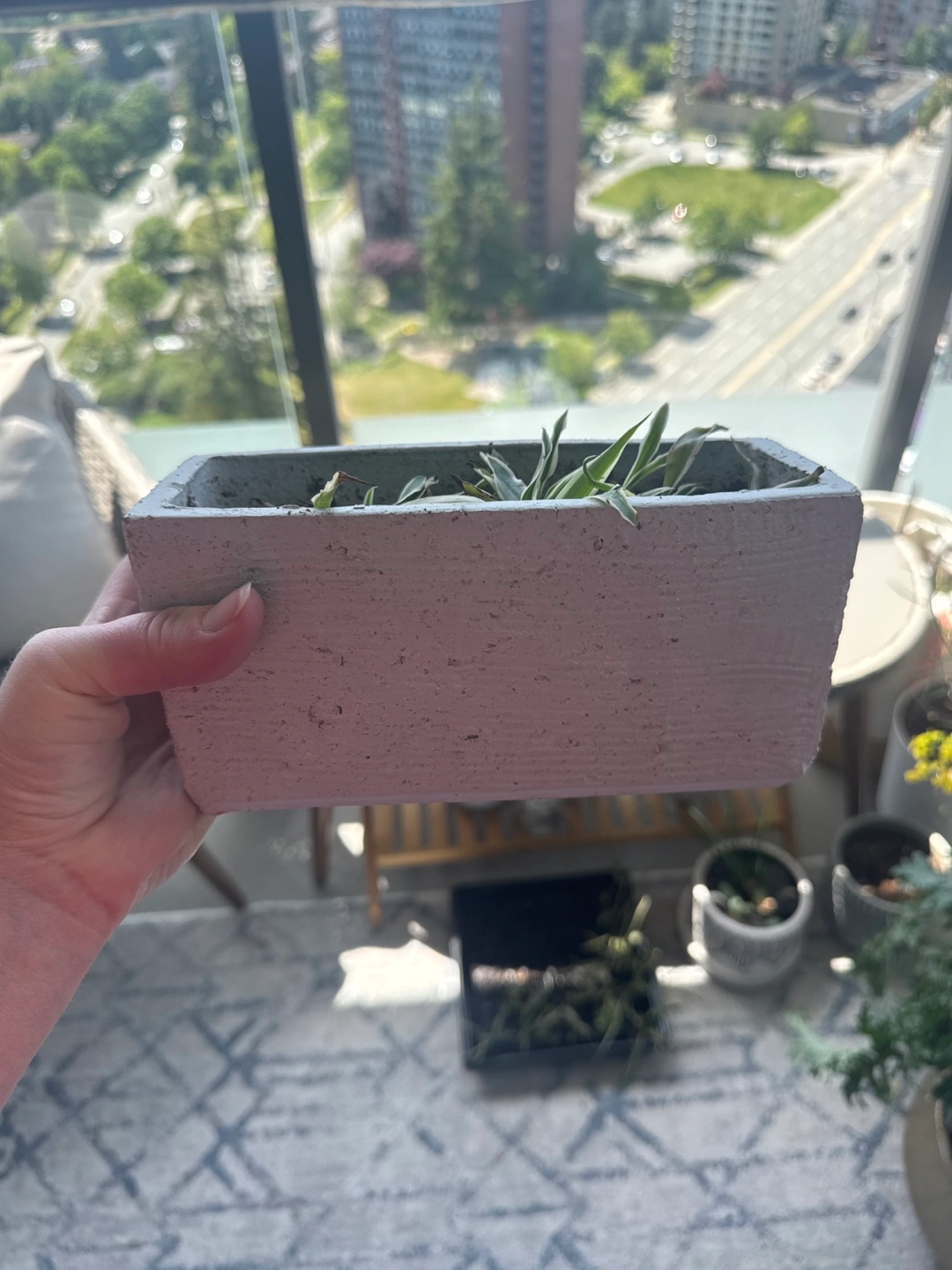 142Rectangular shaped concrete planter with baby Spider plants! Approximately 8 inches long, 4 inches tall, and 2 inches wide. Great for small plants or succulents. Minimalist design. White finish. 20$ or best offer.