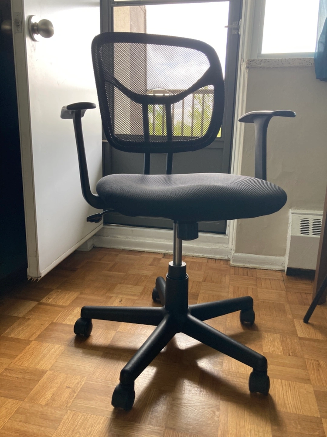 Comfortable office chair, black mesh back and seat. Adjustable height. Five-star base with rolling casters. Slight wear.