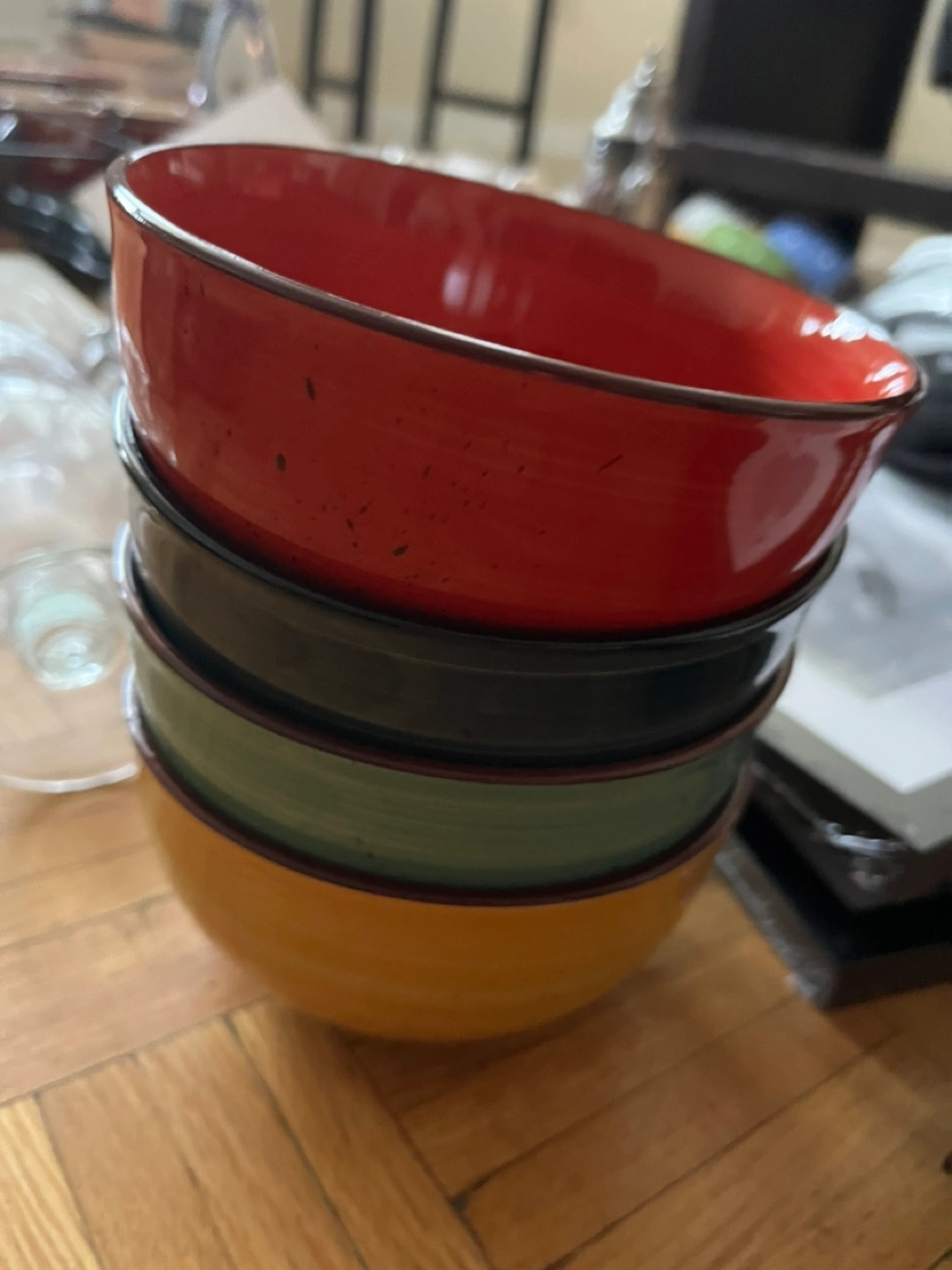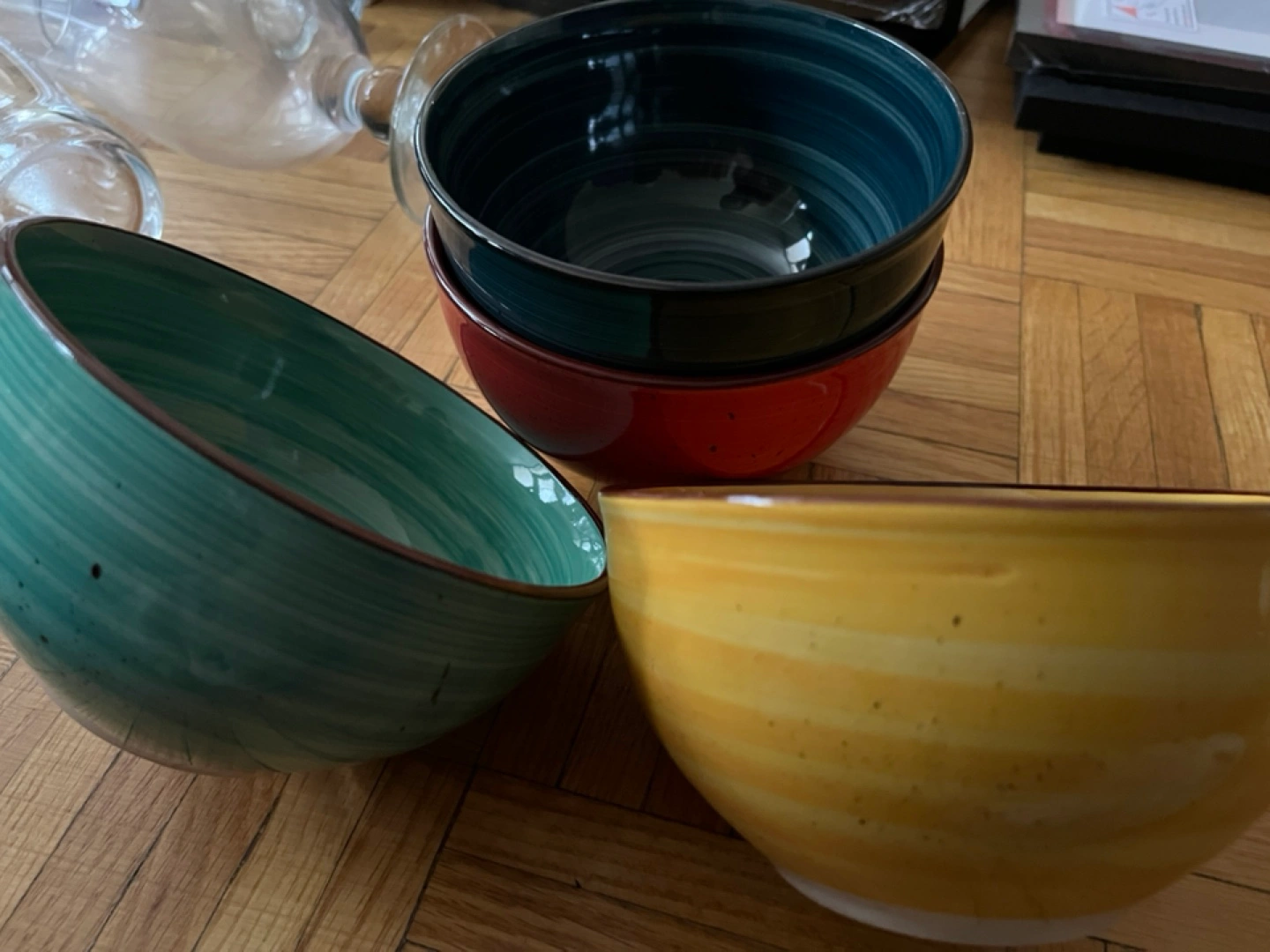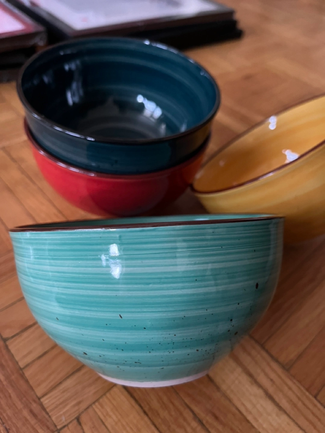 Four ceramic bowls. Various colours and swirling patterns. Great for cereal, soup, or snacks. Like new! You won’t regret,