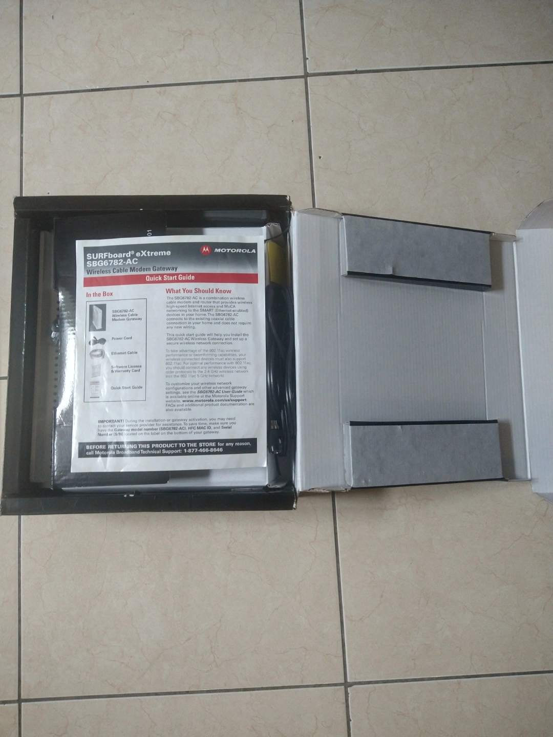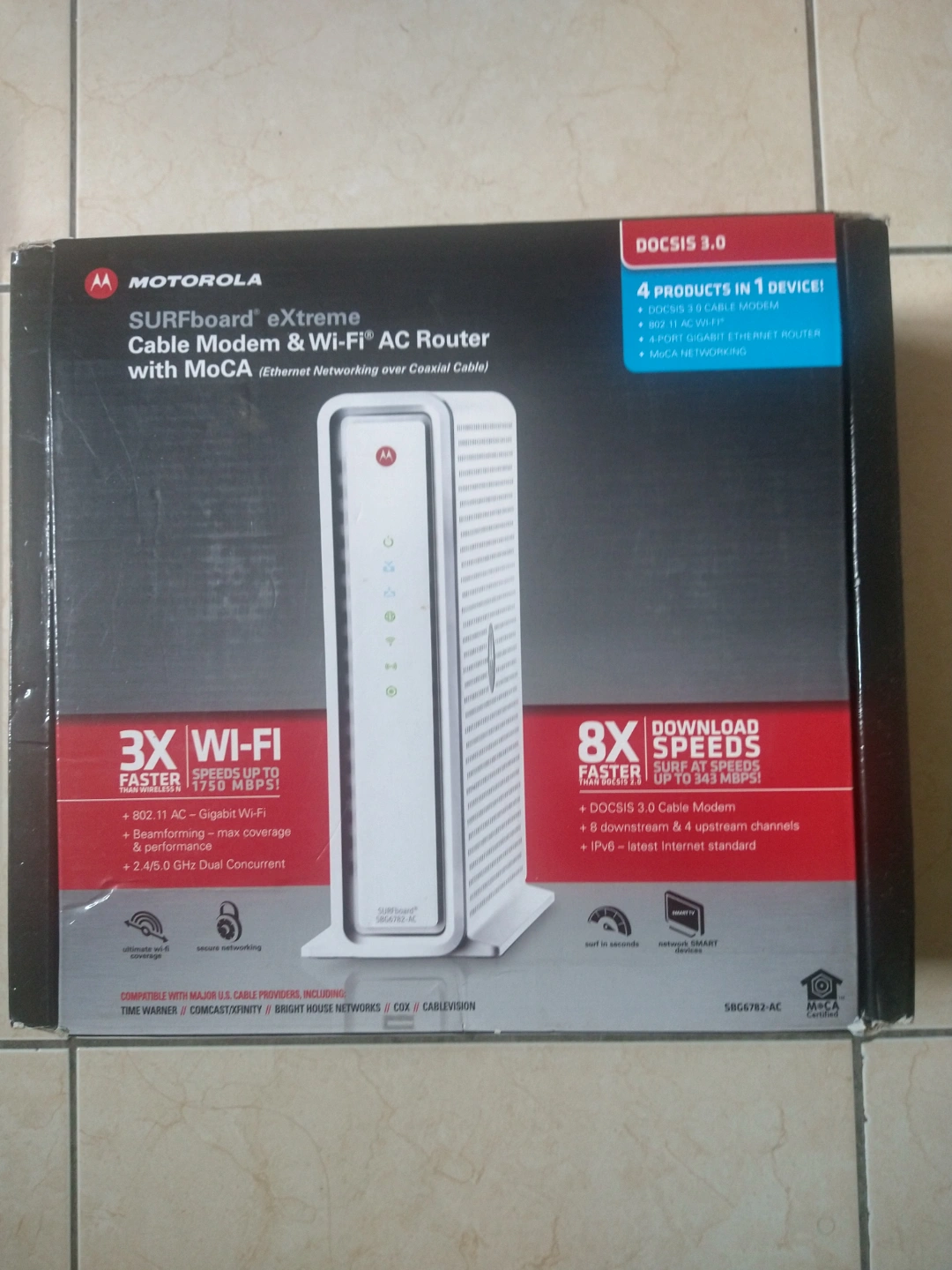 Motorola SURFboard Extreme Cable Modem & Wi-Fi AC Router. Includes cables and documentation. Docsis 3.0 cable modem. 8x faster download speeds. 3x faster Wi-Fi speeds. MoCA networking.