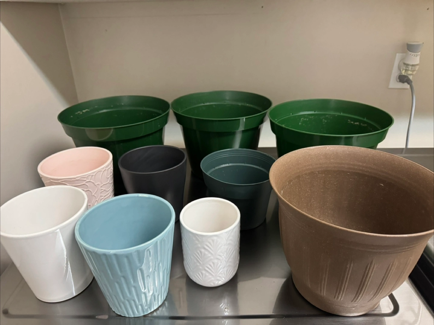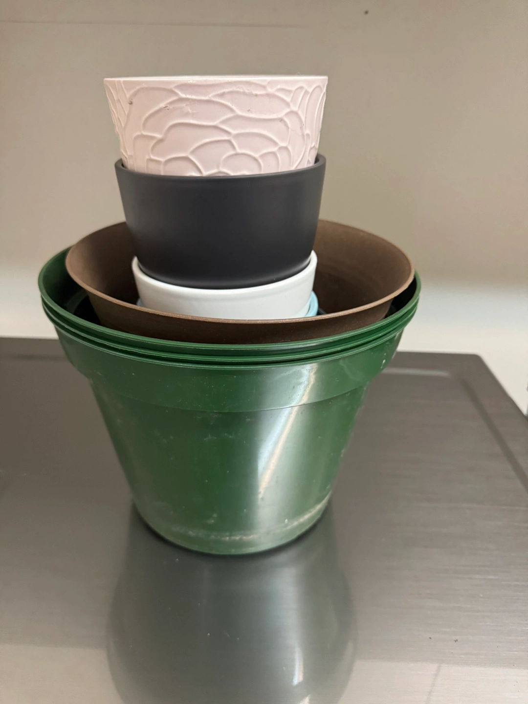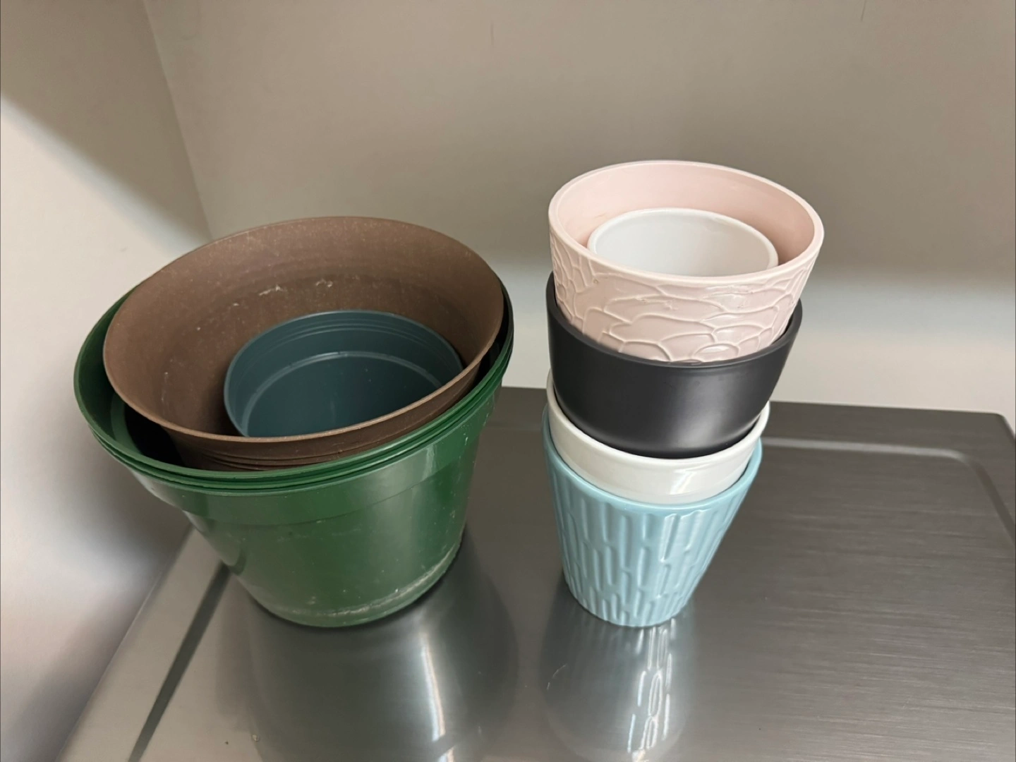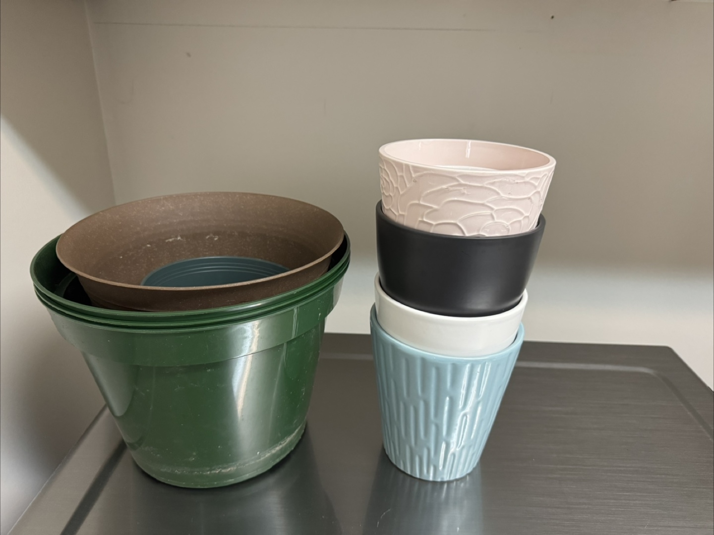 Collection of plastic plant pots, various sizes and colours. Great for gardening or home décor. Includes larger and smaller pots.