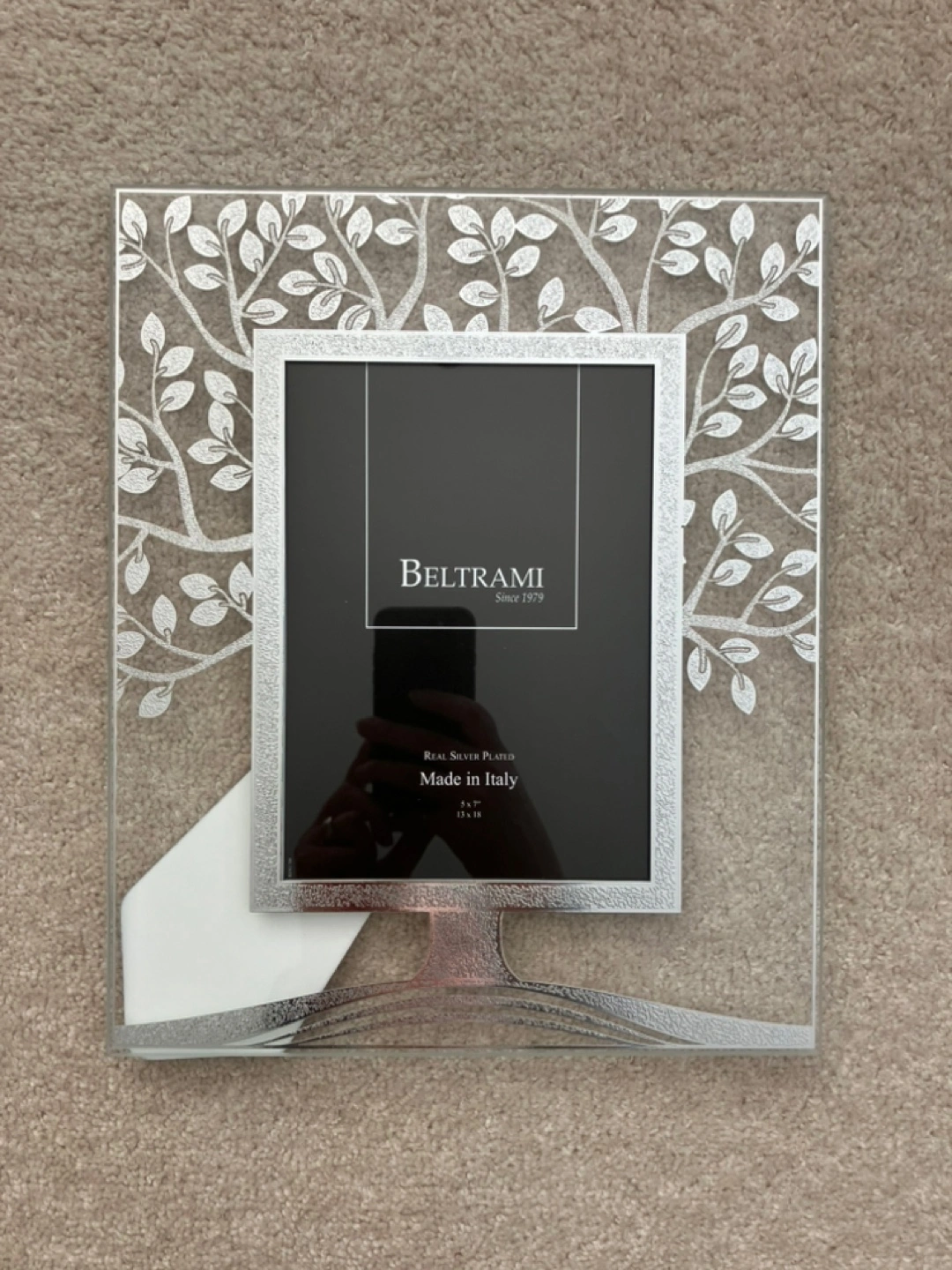 Beautiful glass photo frame. Features a real silver plated tree of life design with easel back. Made in Italy.