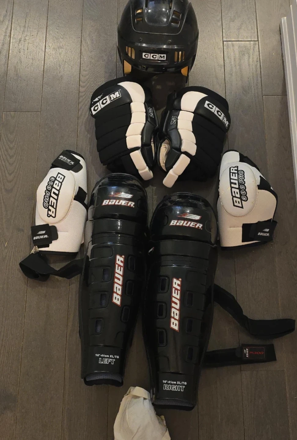 Includes a CCM helmet and Bauer shin pads, elbow pads, protective cup, and gloves. Shin pads are 16"-41cm XL/TG. Elbow pads are 9.0 Pro. A great set for any hockey player!