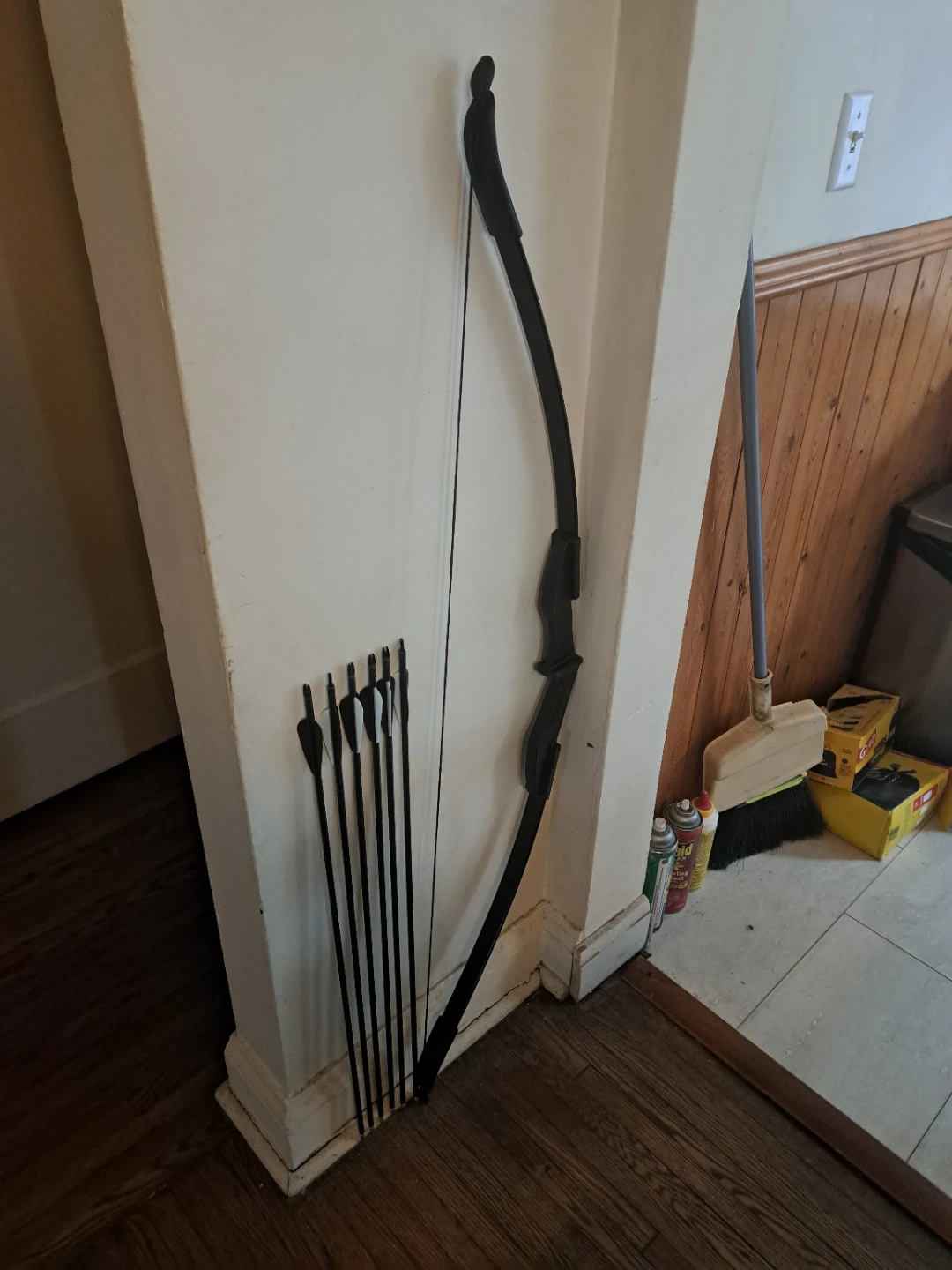 This is a black archery bow with a set of six arrows. Arrows are black with white fletching. The bow has thirty/ forty pound pull