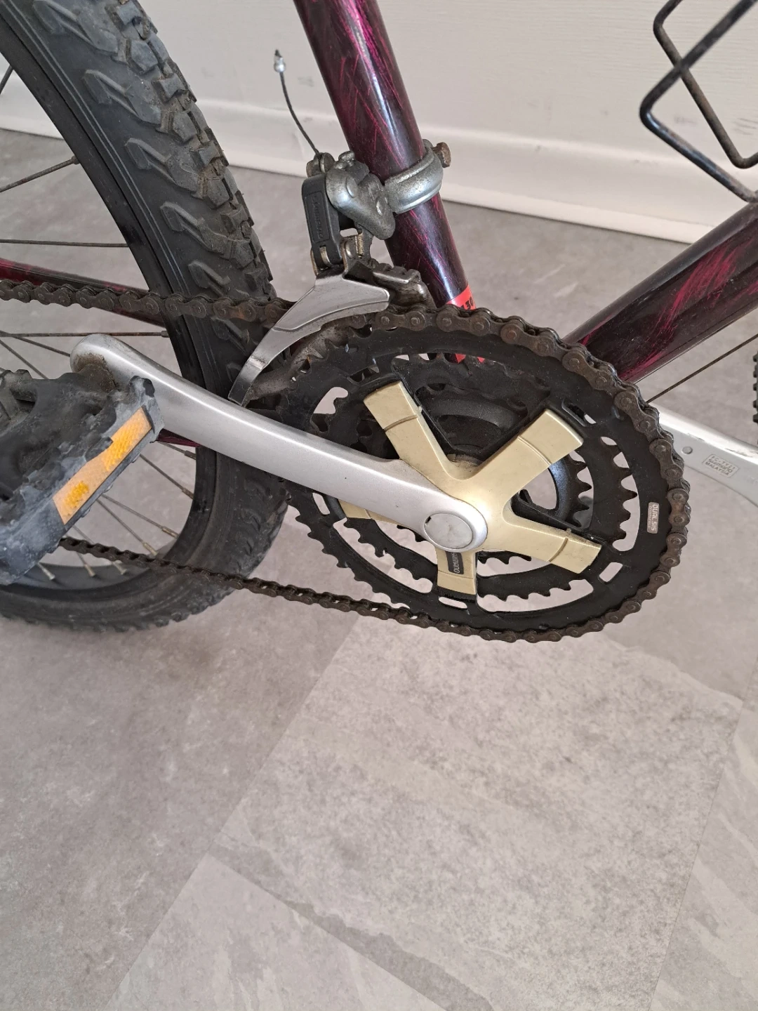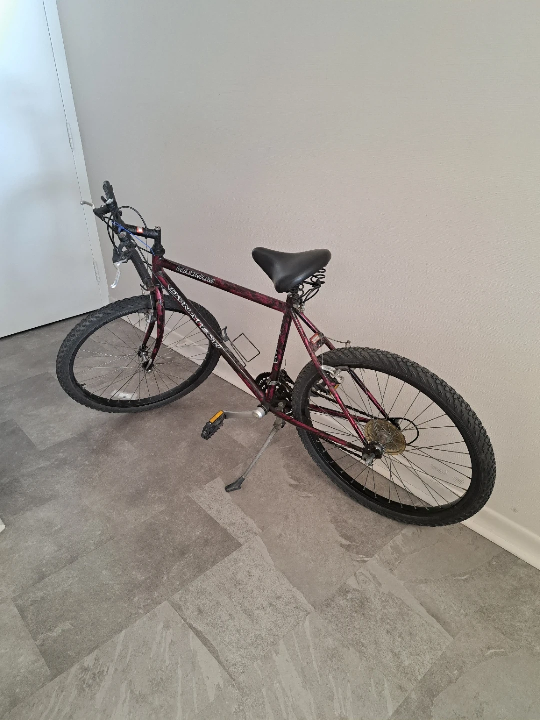 This is a Dynatech mountain bike with a dark pink and black marbled frame. It features knobby tires suitable for off-road use and has a water bottle cage attached. This bike is great for recreational riding and hitting local trails.