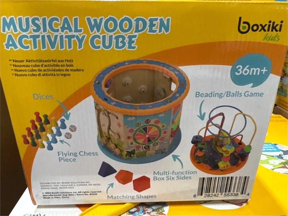 This musical wooden activity cube features 8 different activities including a bead maze, shape sorter, learning clock, and flying chess. It's designed for ages 36 months and up. Great for developing fine motor skills and cognitive abilities!