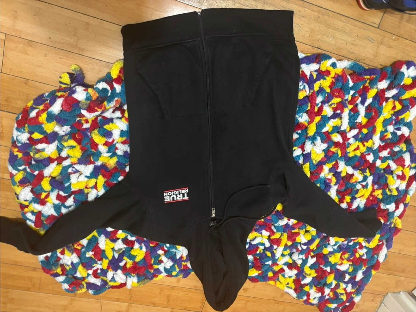 True Religion black zip-up hoodie in good condition. Features the logo on the front and back. Great for layering or wearing on its own!