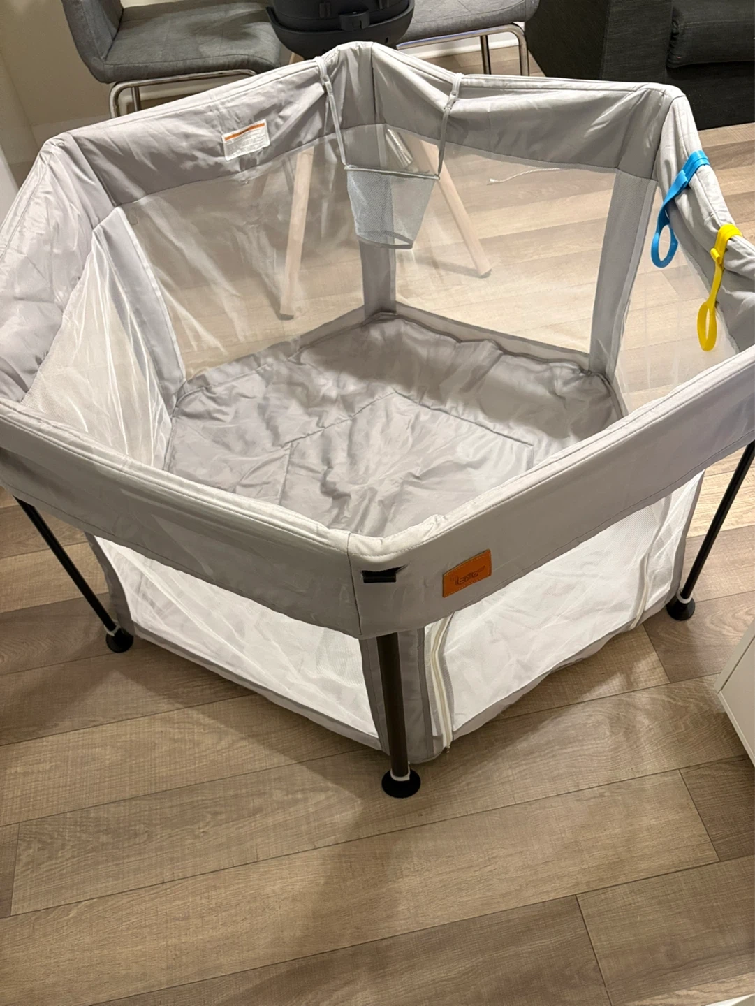 This baby playpen is large and hexagonal, measuring 49.2 inches (125cm) across. It features a grey fabric exterior with mesh sides for ventilation. It's lightweight and foldable for easy storage and transport, with dimensions of 26 inches (66cm) in height and 8.6 inches (22cm) when folded.
