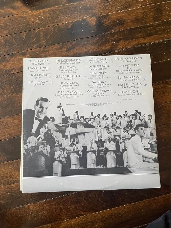 Timeless big band favorites on one great LP! Big Bands – Greatest Hits collects classic swing and jazz standards performed by legendary orchestras on Columbia Records (G 30099) — a Canadian pressing distributed by Columbia Records of Canada.