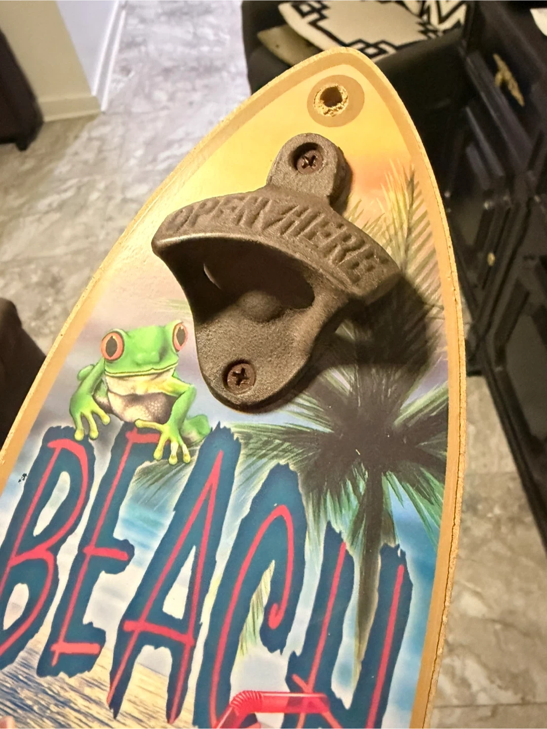 This wall mount bottle opener has a fun surfboard shape with tropical beach graphics. It features a metal opener and decorative design. Easy to mount, it's great for kitchens or bars!