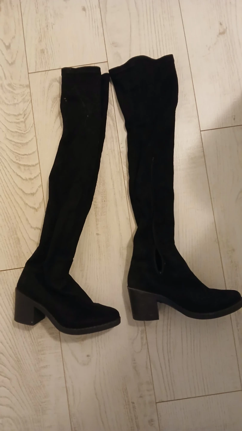 These are black over-the-knee boots. They're made of a soft material and have a block heel. Zip closure on the side.
