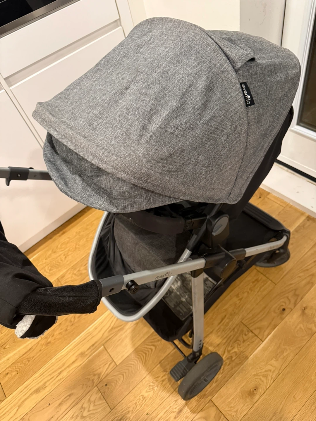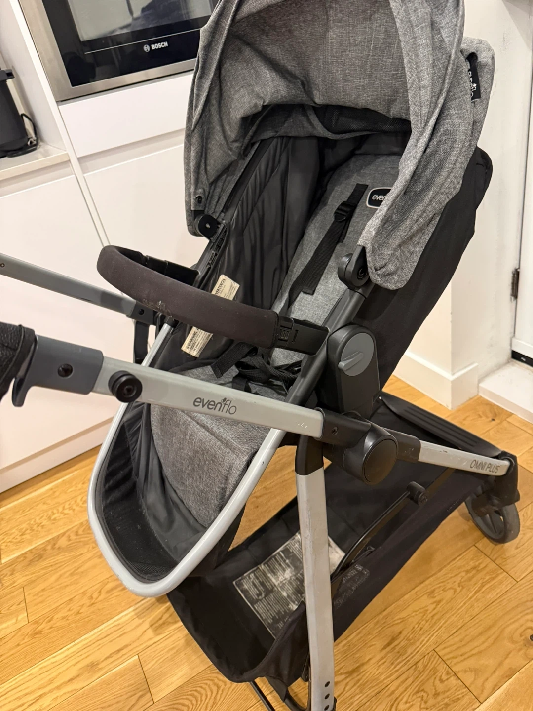 This is an Evenflo Omni Plus stroller in a grey colour. It features a reversible seat and an adjustable canopy. It's suitable for everyday use with your little one.It’s is good condition