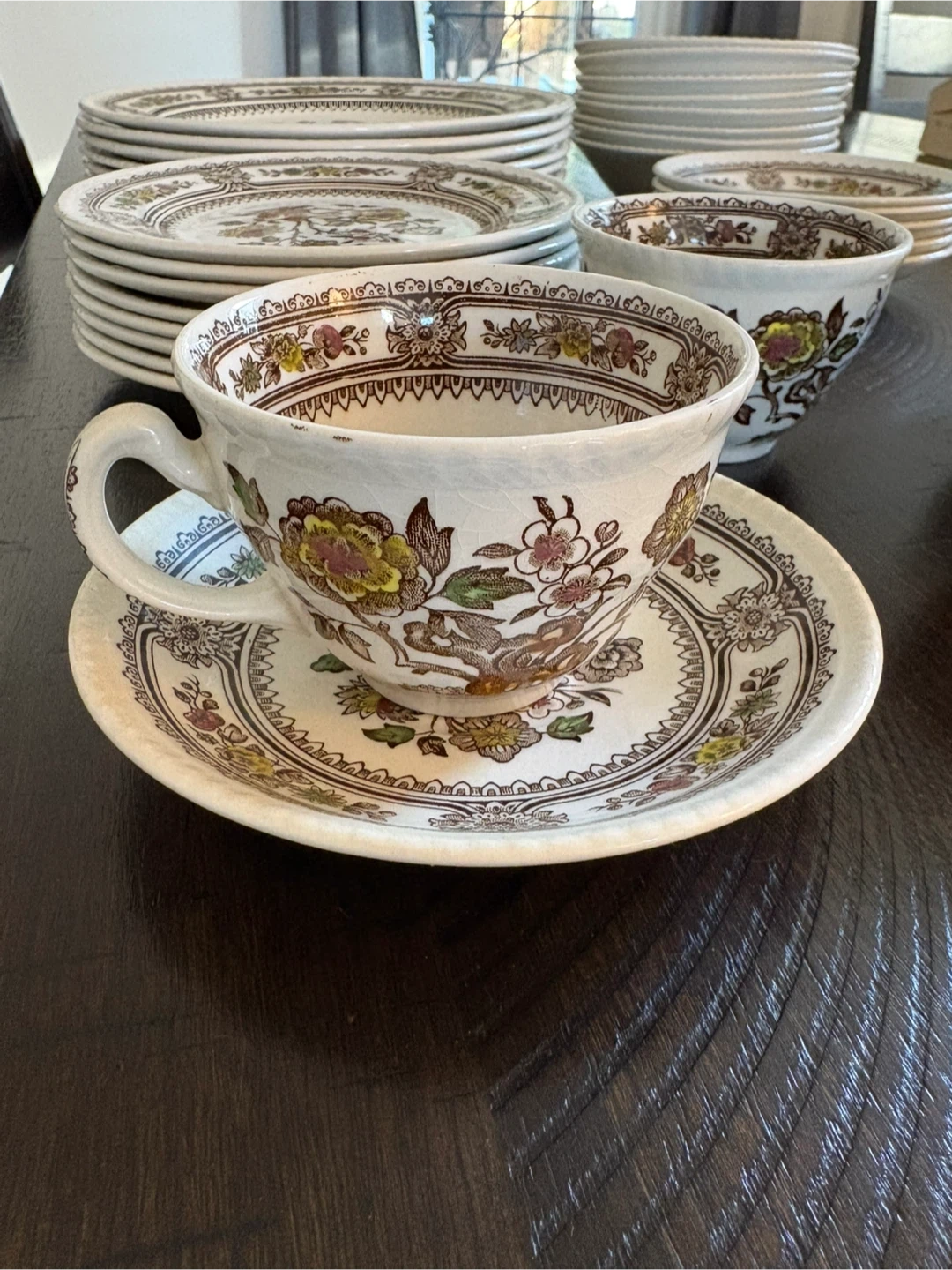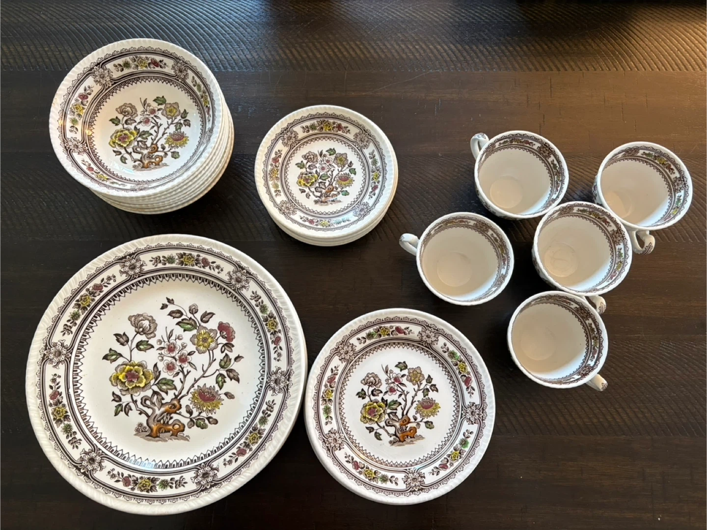 Vintage Wood & Sons Dorset pattern dinnerware set. Made in England with genuine hand engraving. Features a beautiful floral design that's acid and detergent proof. This classic set includes cups, saucers, bowls, and plates.
