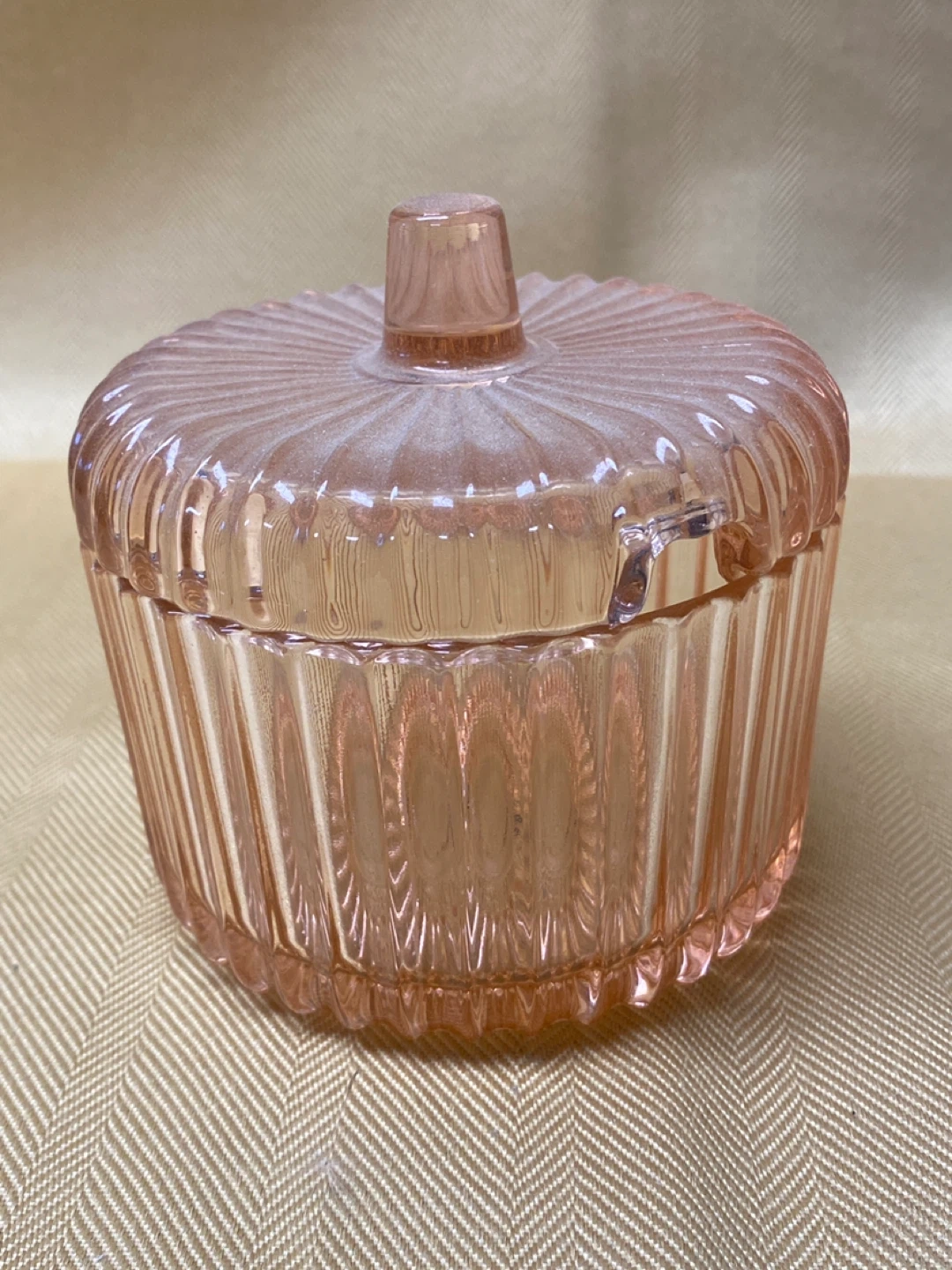 A vintage charming pink glass dish with a textured lid. It's perfect for storing small trinkets or candies, could also be used as a sugar dish.