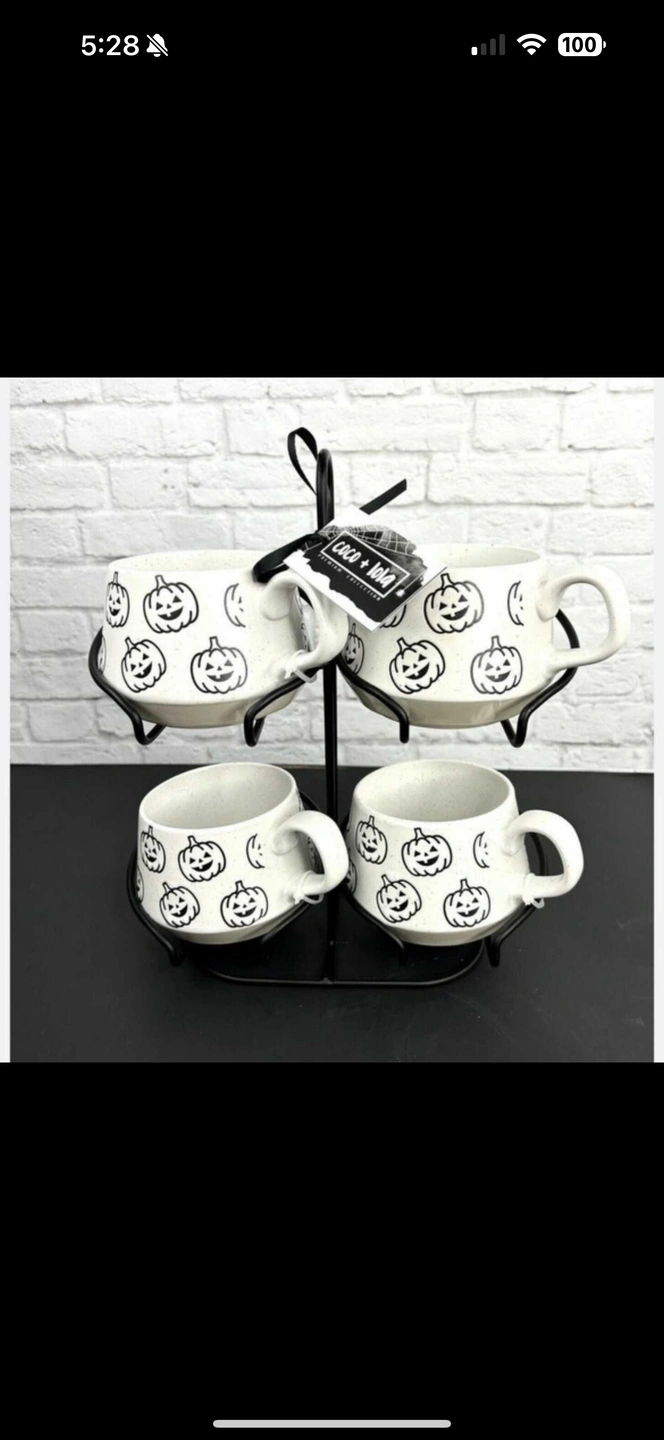 Coca and Lola Pumpkin Mugs in new condition no chips no stains go on EBay for $100…OBO Set of four mugs with a pumpkin pattern, and stand.