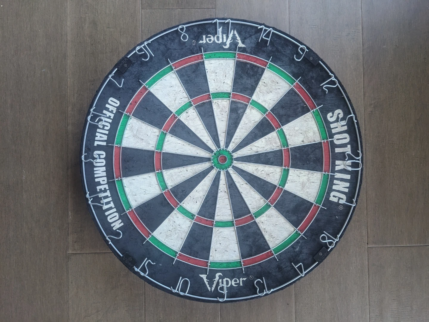 This Viper dartboard is designed for official competition. It comes with a black protector ring to help prevent wall damage. Board displays "SHOT KING" and "OFFICIAL COMPETITION" text.