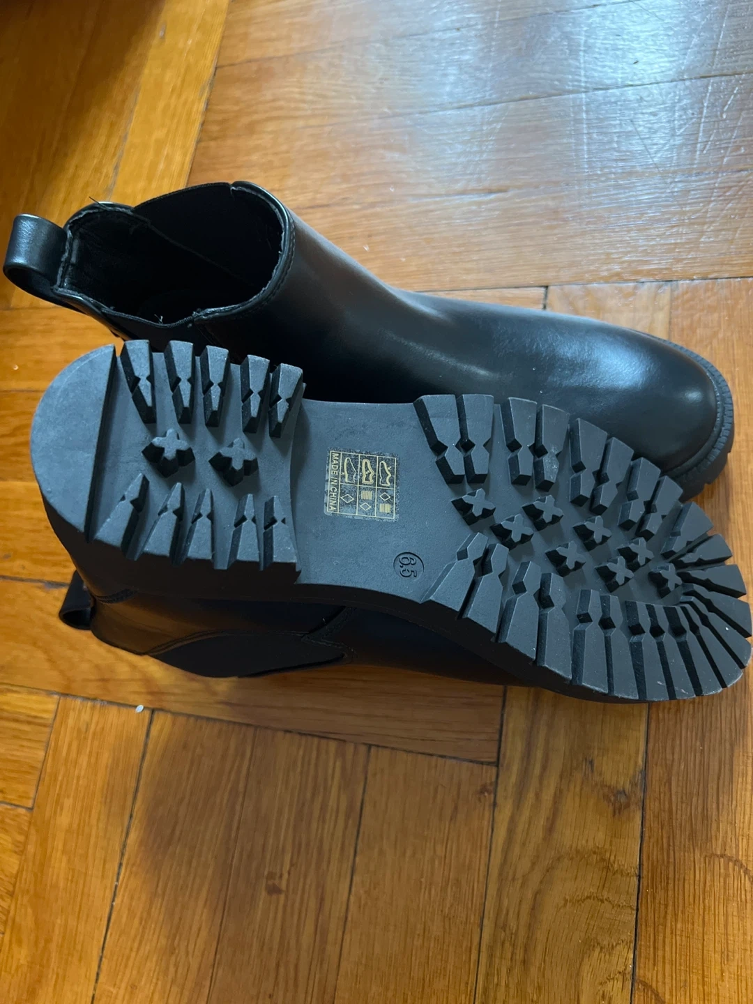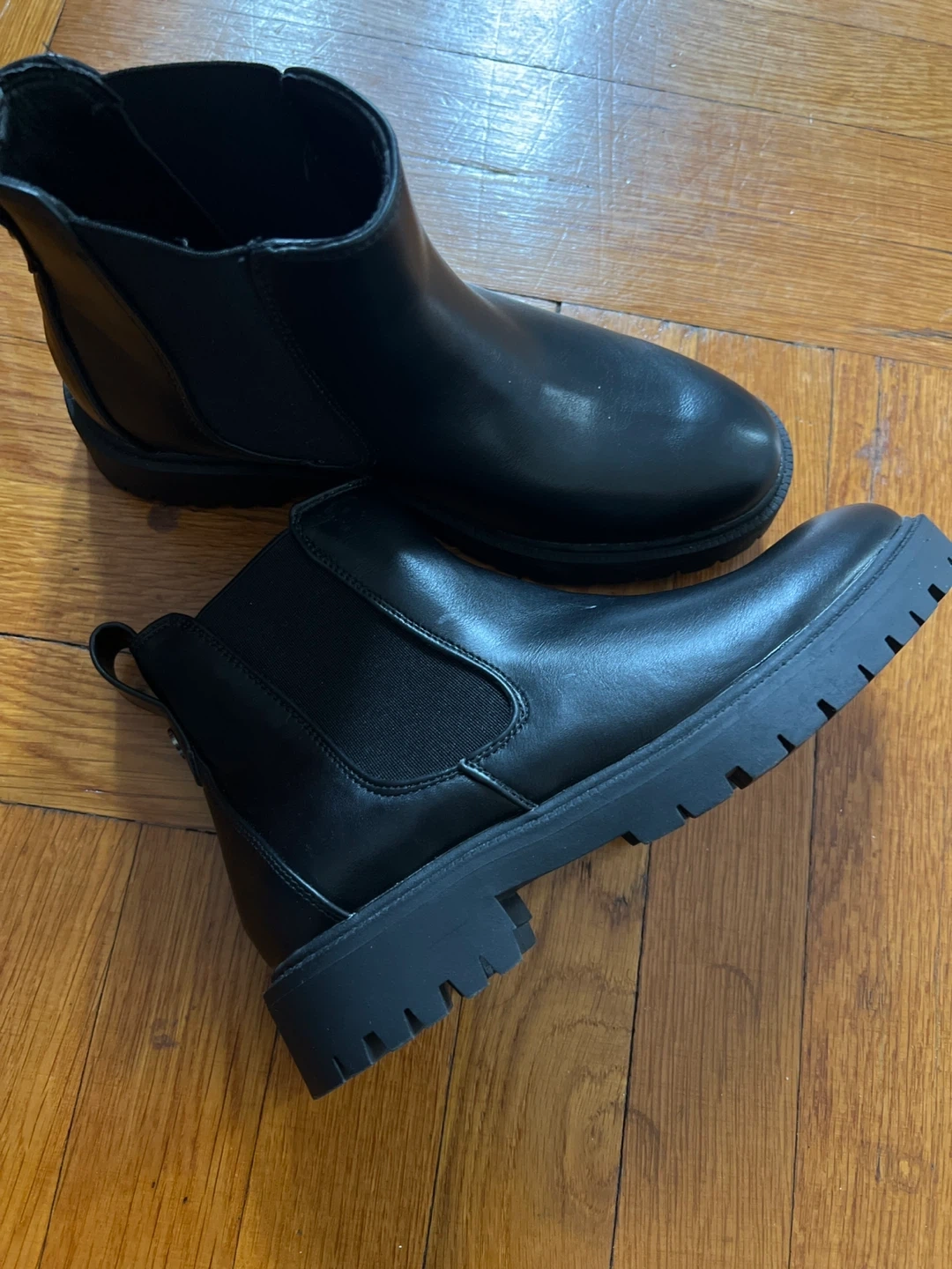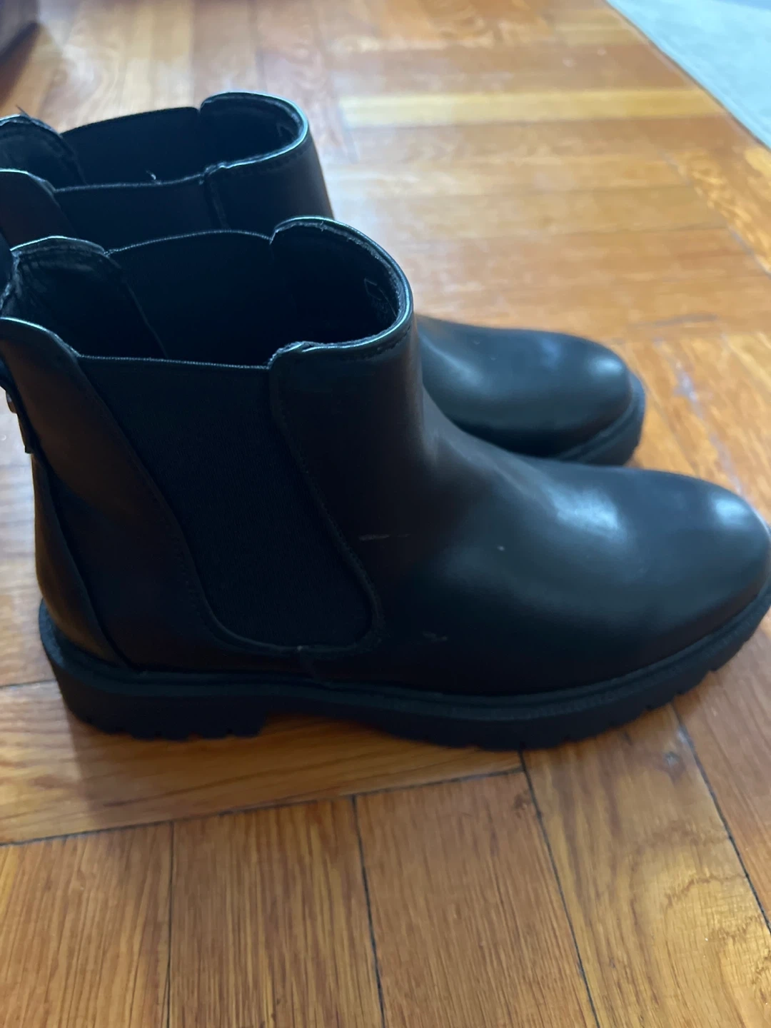 Classic black Chelsea boots. These feature a faux leather upper and elastic side panels for an easy fit. The lug sole provides good traction. Size is 6.5
